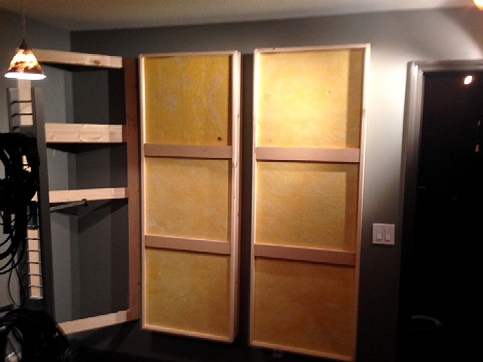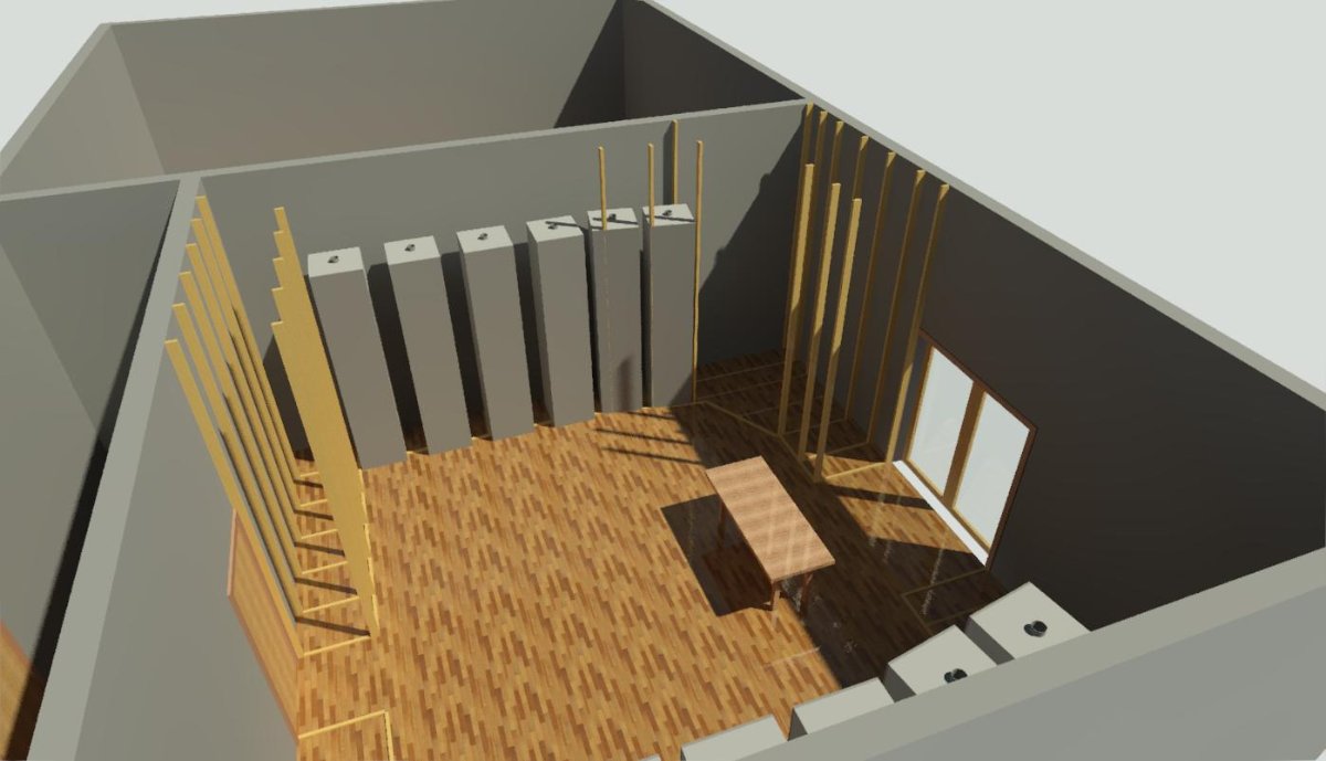 I was thinking that panels should be 60cm deep, so they can act as a really effective absorbers, and not hinged, but centre rotatable, so you can even do 45 degree position. One side reflective, three sides absorptive.