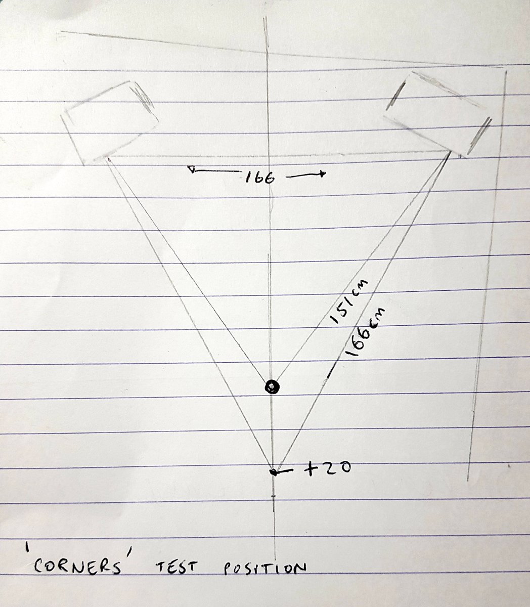 The second round of testing was the 'Corner' test. This is with the speakers pushed right up against the back wall and in the corners.