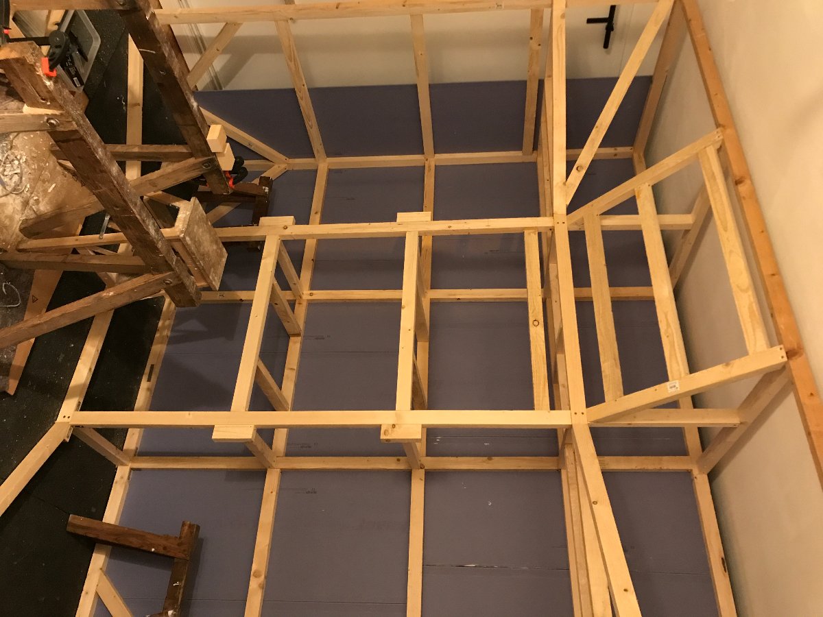 First i measured my Room empty and located the best listening spot/best balanced low frequency spot. I then started to build a wood framework which has an airgap of 30cm left, right and behind against the back wall. I am now encasing the whole framework with sheetrock which i wanted to paint. Everything is sealed except the upper part because i can't reach the ceiling. The speakers will be placed on home made speaker stands filled with sand to make them really heavy. Front holes for the speakers will be cut through the sheet rock and the whole cavity will be filled with mineral wool with a low density.