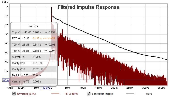 Soundman2020 wrote:Source of the postHere's your actual EDT impulse response graph: Recaro19--REW--IR-EDT-360ms--Jan-26-2020-LR.pngThere's still some pretty large reflections going on, but you can see that overall the Schroeder curve is fairly smooth and even.