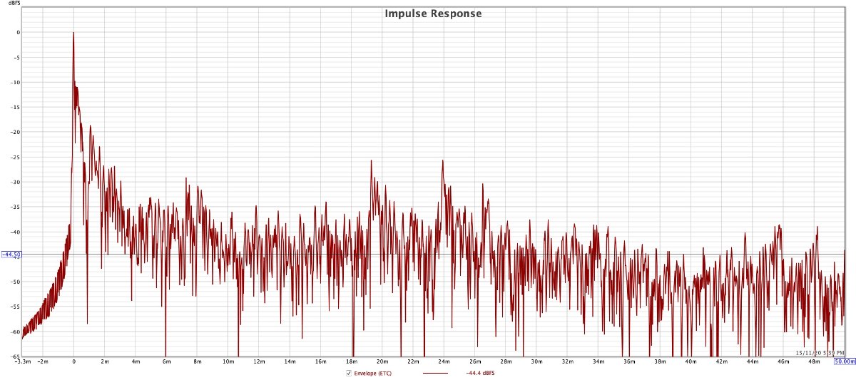 Speakers are 0.8m apart, sitting close to the front glazings and distance between tweeter and woofer measuring 1.15m off ground. I’ve tested a few settings and found this to be the best sounding with no treatment. Note, for the untreated measurements the the speakers and mic position were different, I made some amendments to speaker arrangements to avoid certain modes which seemed better.