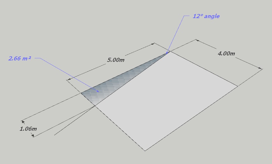 OK, so let's say you do angle your walls at 12° in your room: What did you accomplish? Well firstly, you wasted a hell of a lot of space! :shock: Let's assume that your room measures 5m long by 4m wide (about 16' 5" long x 13' 2" wide): So your left side wall is 5m long, and you angle it 12°... well, that means you have lost nearly 2.7 m2 from the room (about 29 square feet)! It also means that one end of the room is now more than one meter (3 feet) narrower than the other end. Can you afford to waste that much space? Here's a diagram that demonstrates this issue clearly: