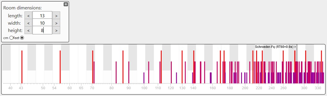 Here's the modal prediction from one such tool for a typical small room: That shows the predicted modes for a typical size home studio, measuring 8 feet high (2.4m), 10 feet wide (3m) and 13 feet long (4m). The grey-and-white background of that diagram is actually a piano keyboard, so you can see the relationship between the musical scale and the modes. Each vertical line shows the position of one mode. The longer red lines are axial modes, the intermediate length purple lines are tangential modes, and the short blue lines are oblique modes. There's also a frequency scale across the bottom, so you can see what frequency each mode is at. I won't go into more details about that yet.... later...