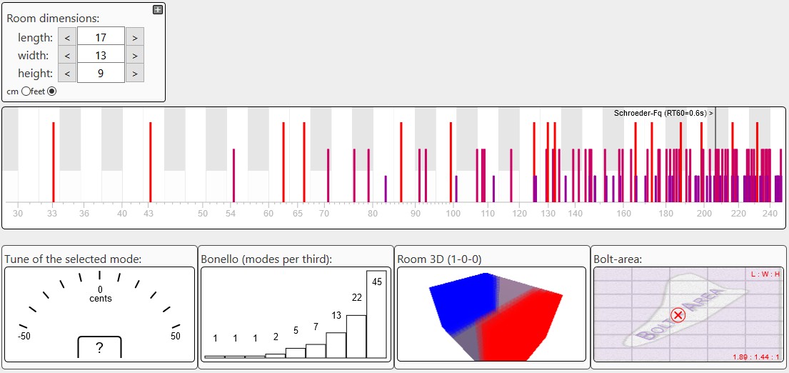 Along with all the other researchers mentioned above, in the late '70s/early '80s a guy called Oscar Bonello came along, and presented a theory that, if you plot the number of modes in each one-third octave band for any given room, then the resulting graph should show a continuous rise with increasing frequency: in other words, the number of modes in each 1/3 octave band should be greater than the number in the band just below it, and less than the band just above it. Worst case, it should be the same as the one below it, but not lower. He postulates that if there is a decrease in the number of modes as you go up the scale, then that's bad. Thus, many room mode calculators today will also generate a "Bonello plot" to show you that information, and help you make a decision about your room ration. Here's an example: That one shows the actual set of room modes across the top for a room that measures 17 feet long, 13 feet wide, and 9 feet high (I chose those numbers arbitrarily). Ir also has several smaller plots below that main graph. The second one from the left is the "Bonello chart", and the one on the right is the Bolt plot. The red "X" marks the location of this specific room ration within the Bolt area. Also, you can see that the Bonello chart shows that the numbers stay the same or rise as you go from left to right, and visually you can see on the top modal plot, that the modes are fairly evenly spread out. This room would probably be good, from the modal point of view. Now here's another one, where I made the room two feet narrower but kept the length and height the same: As you can see from the Bonello plot, the numbers go up, then down, then up again, then down, then up again, and the ratio is well outside the Bolt area. You can even see from the actual modal plot across the top that they are not spread evenly now: there's a big gap between 31 Hz and 51 Hz with no modes at all, then several bunched together around 85 Hz... etc. So this room would probably not be good, from the modal point of view.