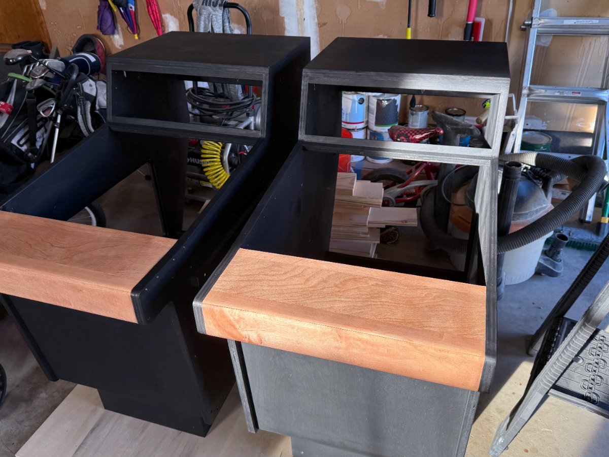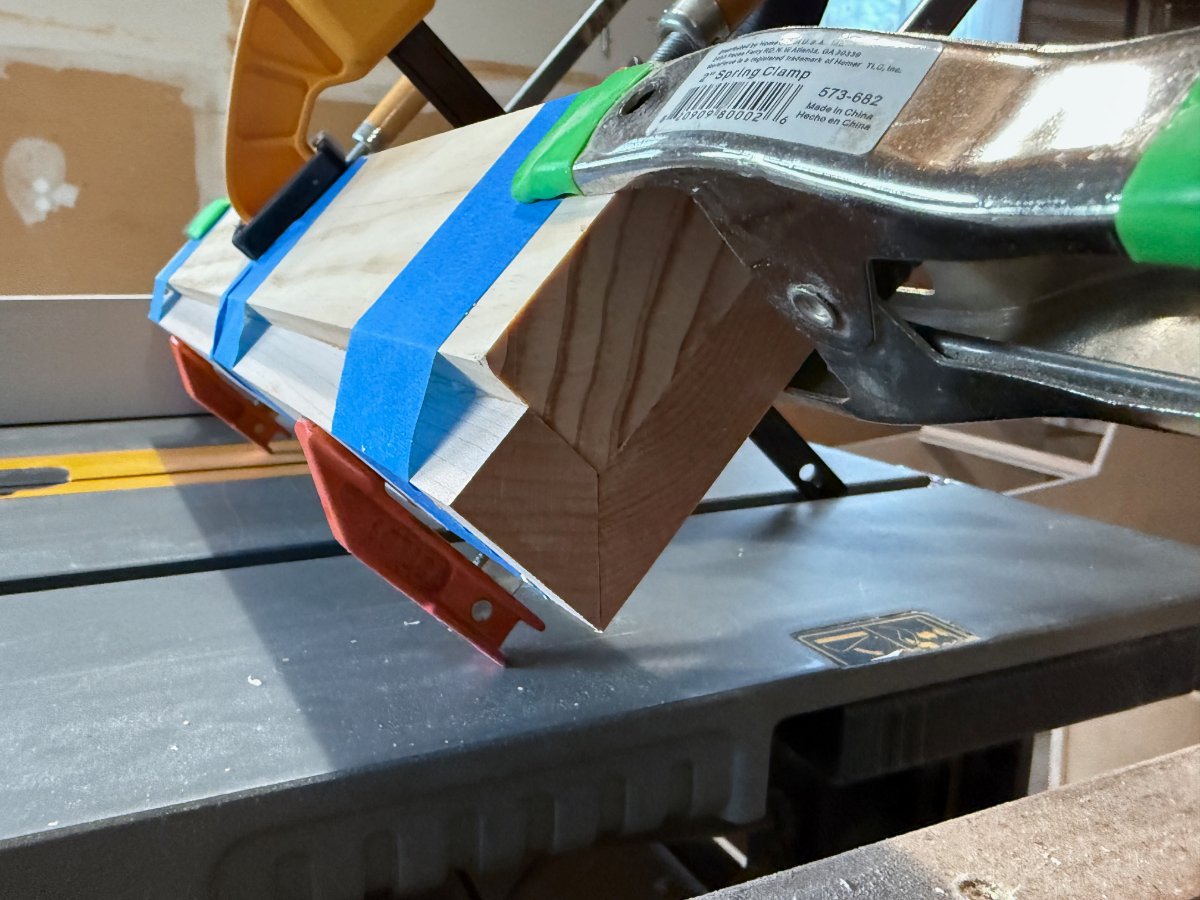 This was a complicated glue up. I wanted to make sure the arm rest was robust, my last edge. was pine and didnt hold up well to wear and tear. This time I made the arm rest out of 1x4 & 1x3 maple, wrapped around a 5/4 stock piece of pine for reinforcement. Glued them, trimmed them down and used a roundover bit for the first time. I think they came out fantastic! The maple was so great, a stark contrast to the absolutely AWFUL home depot sandee ply that I used for the rest. At $80 a sheet, that is the worst "furniture grade" plywood I have ever used. It has so many knots, some of the layers were pressed incorrectly and overlapped causing bulges, and it delaminated like crazy. Not good.... but I made due.