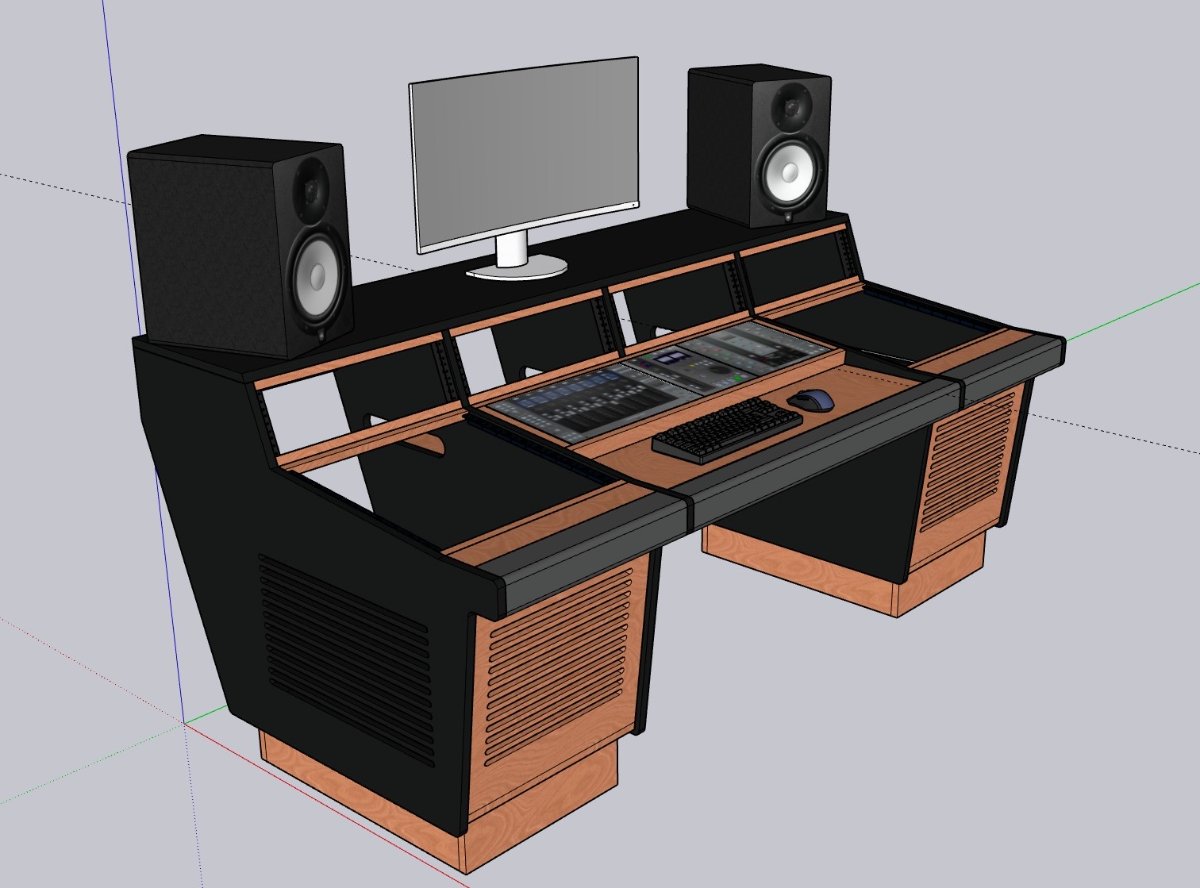 Well, I finally finished building my studio and I really wanted to update my desk to move my amazing SSL UF8, UC1, and UF1 controllers up from the keyboard tray and into an embedded prime location on my desktop. Also needed a bit more rack space, so wanted to upgrade from 24U to 32U to support my GAS. The following is what I designed, and how it ended up being built.