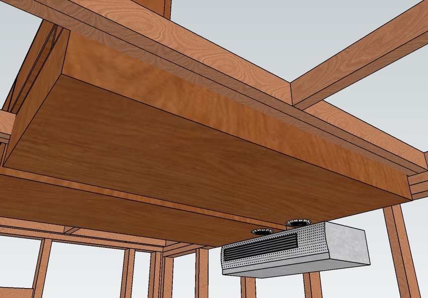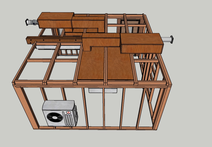 I've been working on re-designing the HVAC system for my studio design after some very helpful input from Stuart. This includes eliminating wasted space in the wall cavities between the inner and outer leaves and repositioning the inner leaf silencers to the ceiling so that, on the input side they guide airflow directly into the AC unit.