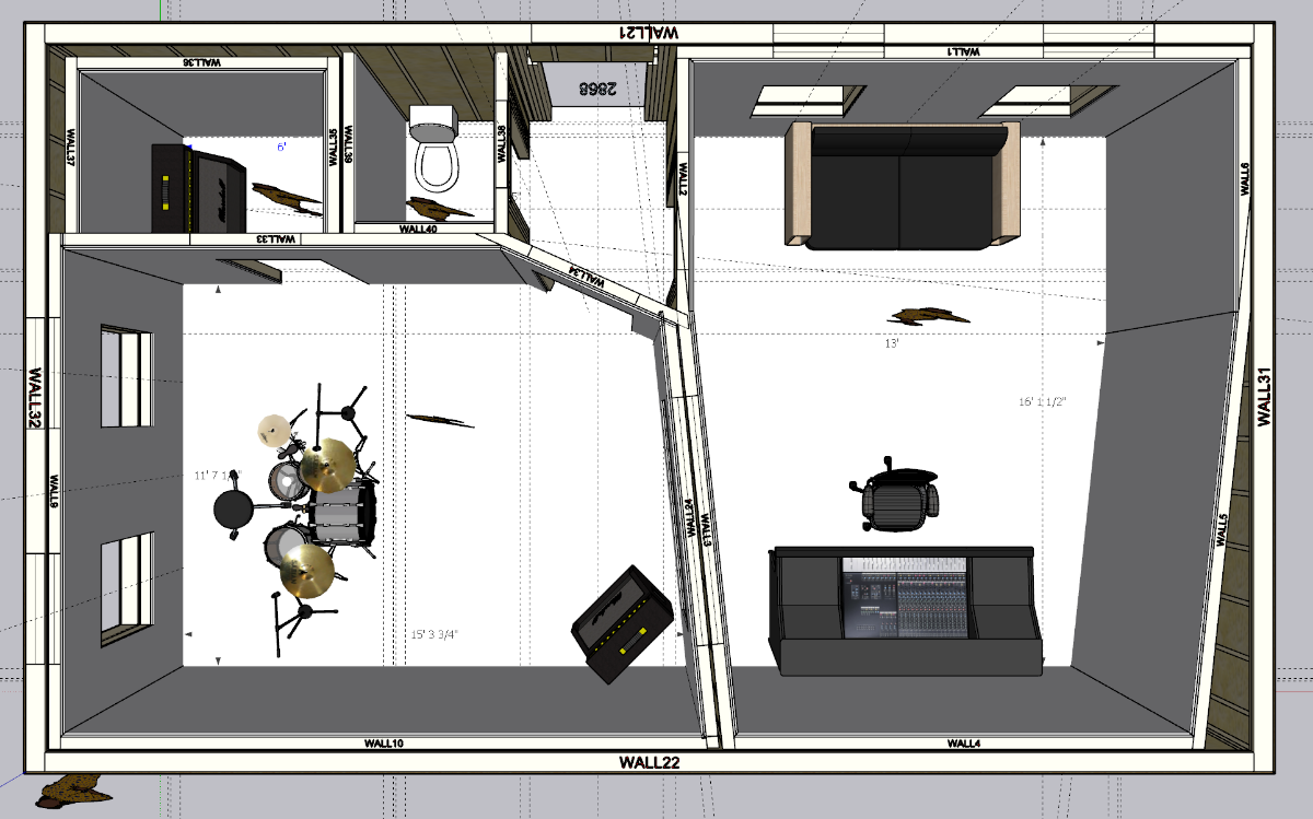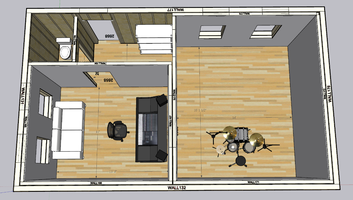 Here is the updated sketch, I was able to free up a few square feet in the live room by removing the splay. so that helps. Its still not huge, but I think for a small at home tracking room it will do. Especially with a high 11' + ceiling.