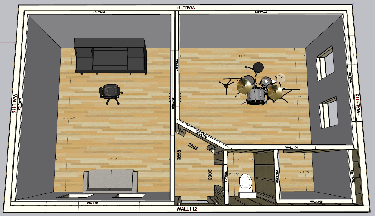 I might actually have to do this in the live room. I spent the weekend playing around with the design trying to get the most out of it. I have 180ft2 in the live room and 200ft2 in the control. If I do the inside out walls in the LR I can gain another 12-15 sq ft. That gets me damn close. The LR will also have 12' vaulted ceilings, so I will have well over 1500ft3 of volume in the room.