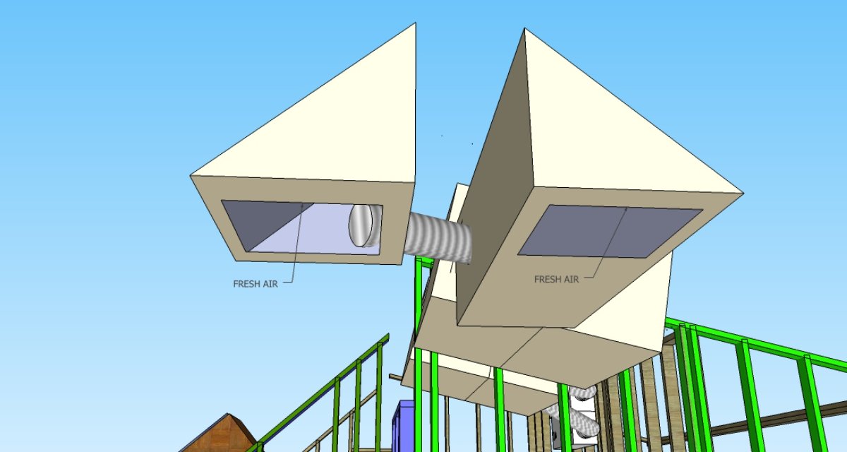 Here is a first sketch of the Fresh Air supplies and Stale Air return along with the four baffles. From the ERV Id use 6" flex duct up to the outer leaf baffles. I'm now considering using 2" duct board to build the baffles. I would again use 6" flexible duct at the penetrations of the inner and outer leaves. (Only the outer leaf wall in green is pictured here):