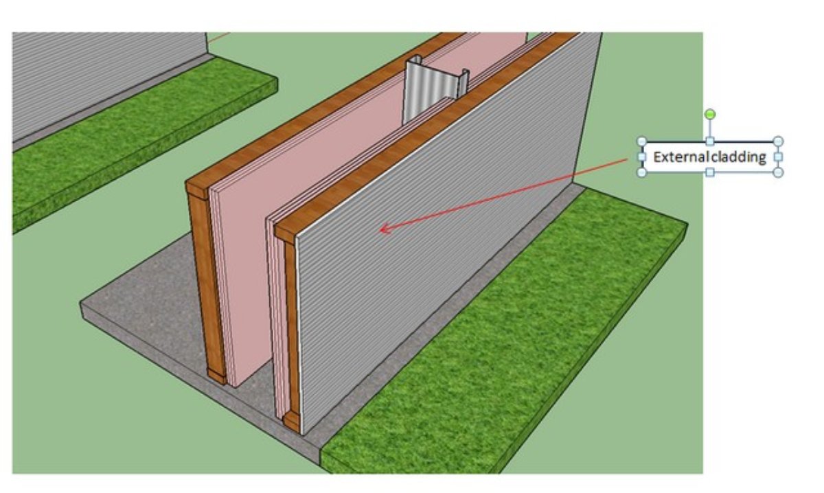 Option 3. Move to a hybrid structure depicted below where I bring the outer wall inside the frame and have it sit on the 2 layers of 90 x45 as described in Option 2 above. This gets me a continuous mass; brings me to the same position in the room as Glenn’s design; and gives me an air gap of 200mm – my target. I have included a shot of the cladding rather than try to do it in sketchup - while it could be considered a third leaf is has very low mass (.42mm thick) and air flows freely behind it