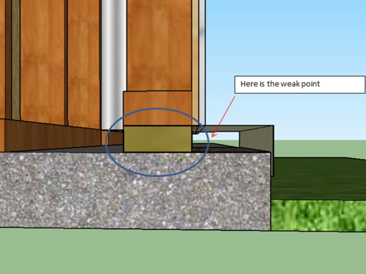You can see in this pic below that there is air space between the base plate and the DPC – the 10mm packer sizes it at this point - there are other packers but they are in the shadow under the timber. This is due to variability in the slab. This means that for the majority of the perimeter the only surface between the outside world and the inside of the outer wall is 0.3mm of aluminium – the DPC. (What I was going to do in my original design was to lay down some extra base plates inside the current one with a DPC and plenty of caulk underneath. The outer leaf was to sit on this. The bottom 90 x 45 would be planed to get close to the slab profile so that the gap underneath stayed manageable for the caulking/sealant underneath and the top would be level.)