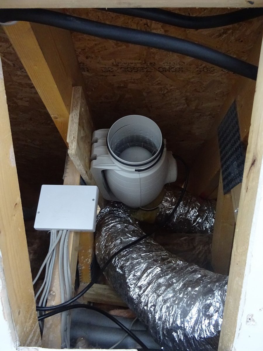 I tidied up a bit in those eaves and put as much insulation as possible in there, tested the fan, then closed the hatch.