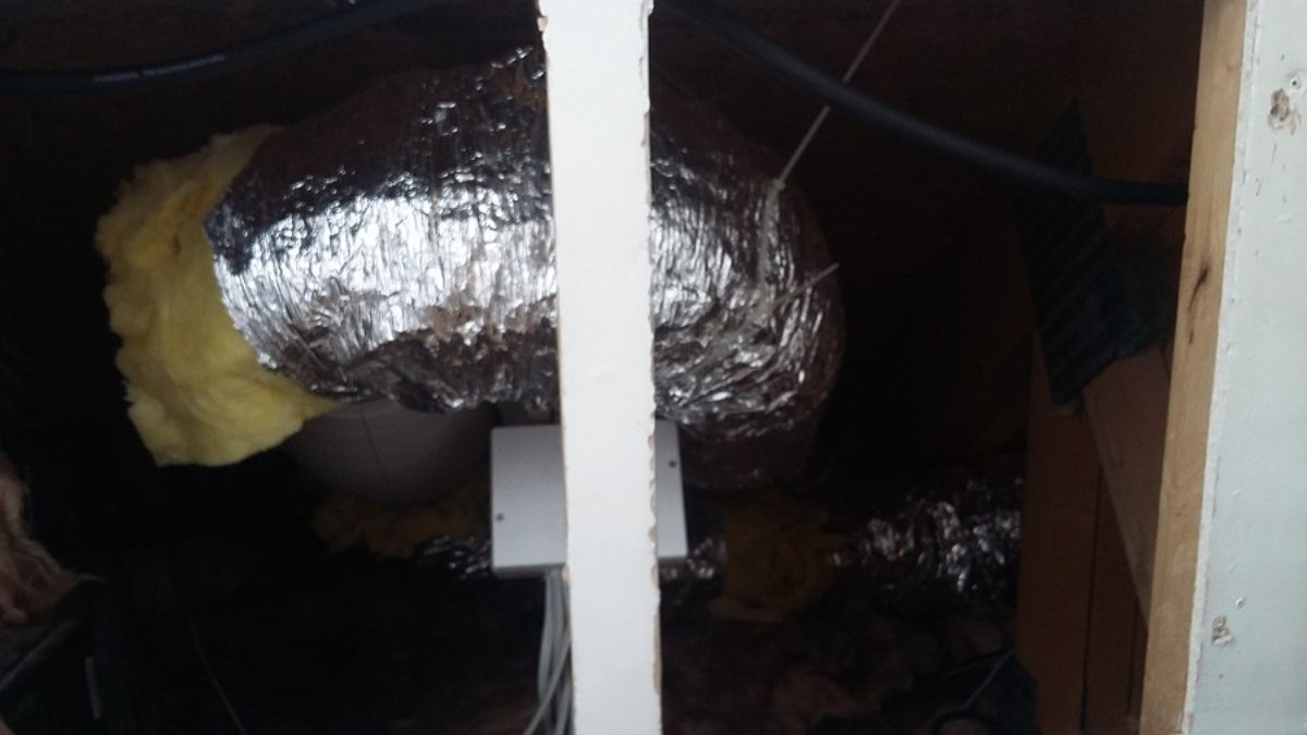 Speaking of further work, I installed the fan in there today. I have two schemes in mind, the first uses a couple of ninety degree elbow joins to turn the corners. I was concerned they would make too much noise, but wanted to try it anyway.