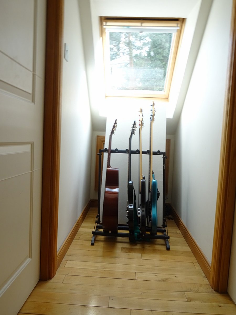 Baffle with 18mm plywood backing placed in front of computer reduces the sound from the computer a little bit and makes it look a bit better I think. Guitar rack in front of all that.