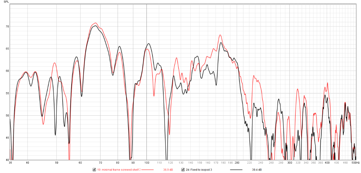 I did loud REW sweeps through the monitor in both setups and measured them with the mic in the room below. Black is the isopod, red is bolted to shelf.