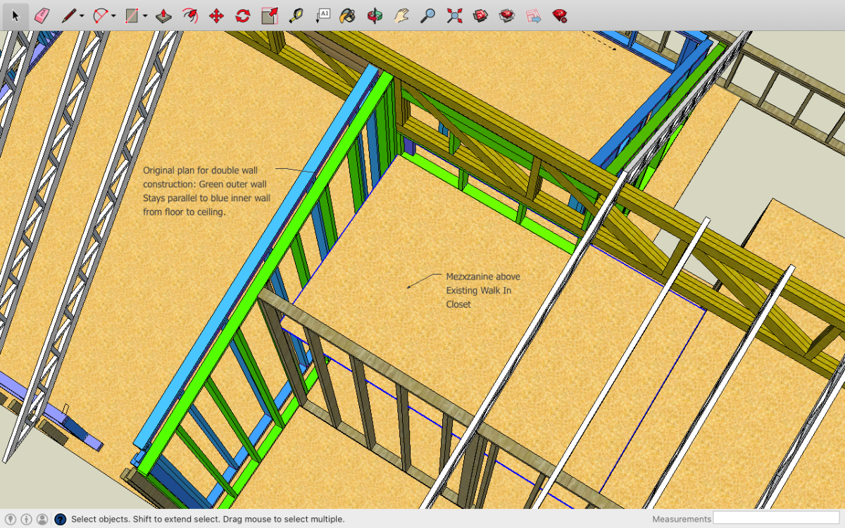 The first 2 images show the original plan for the double wall construction (Inner wall blue, outer wall green). It also shows the mezzanine space above the existing walk in closet. This is where the air exchanger will be. My question is how can I best use some of that space to increase LF absorption.