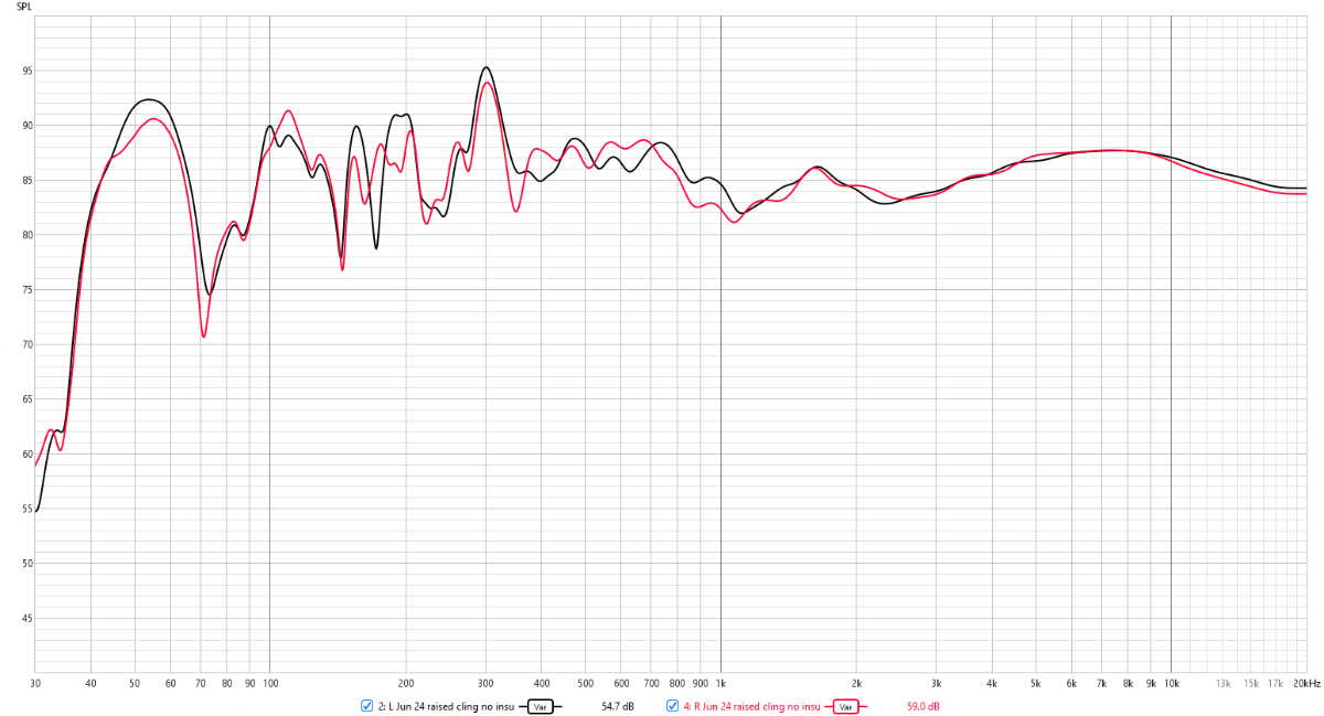 Frequency response plot for left speaker. Black is with only the cross beam absorbers I attached yesterday. Red with the newly added 200mm thick recessed absorbers. Some incremental improvements.