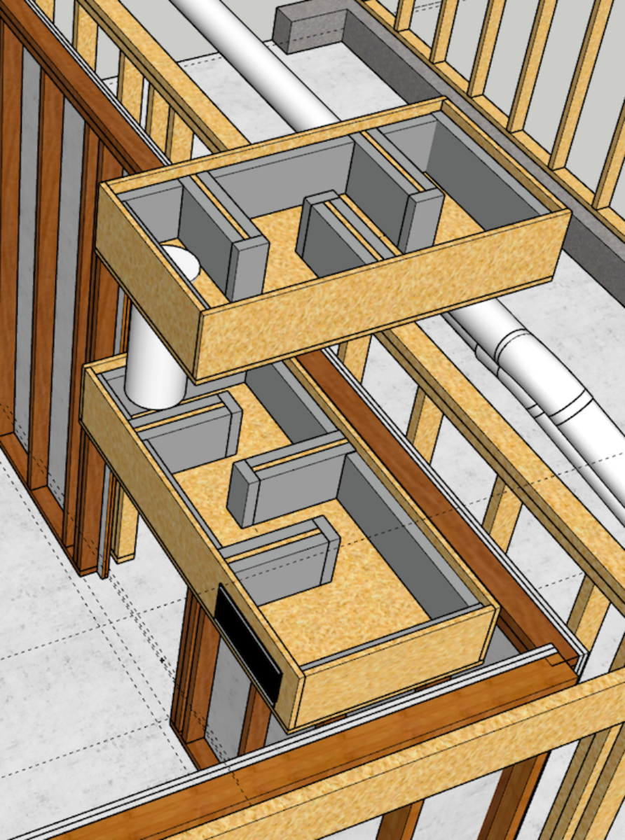 Here’s an rough model I made with just two larger boxes, just so I could see what sort of space logistics I’m dealing with. I have a 16”OC joist grid where I can drop the duct into the room (14.5” square area). I still need to model the four-box version, to see if hanging two inside the room is even feasible.