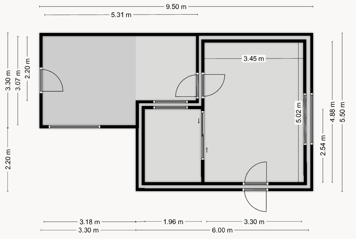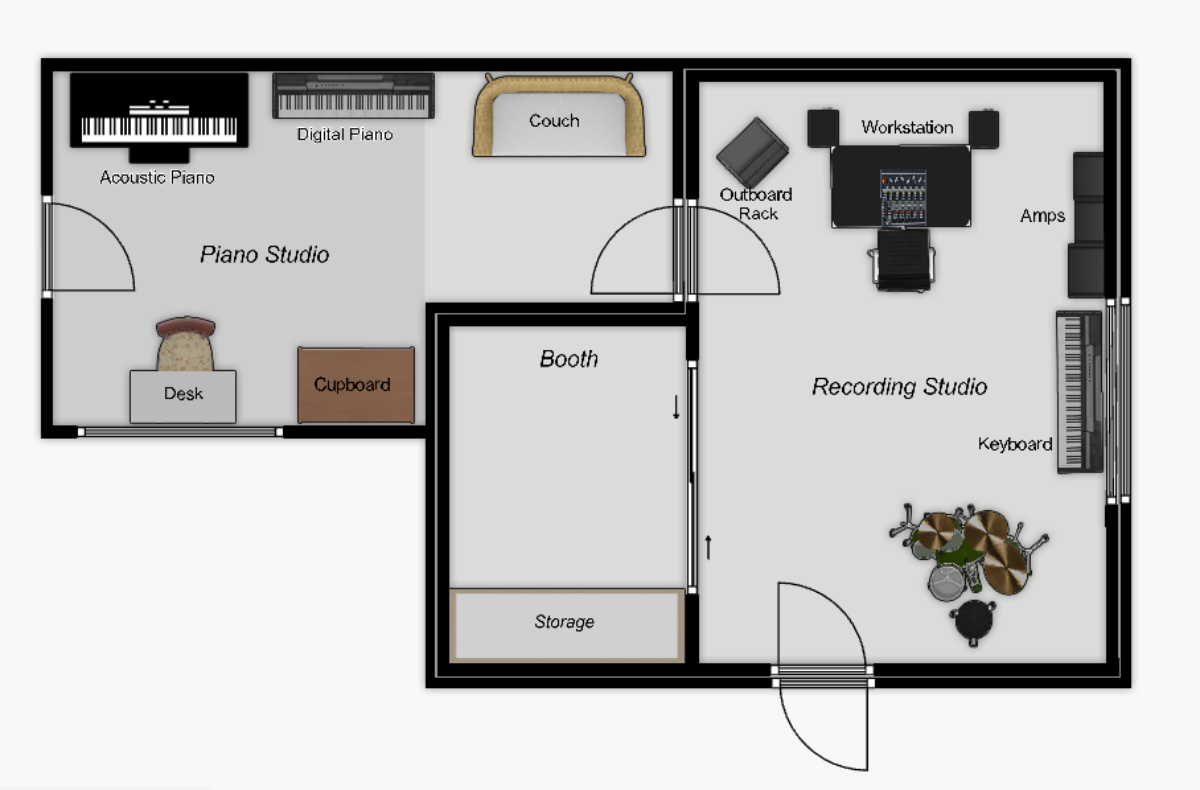I placed a main door directly into the Recording Studio, offset to one side so I can place a drum kit next to it, but leaving room in the corner for bass trapping. I considered placing the entrance into the Booth and using it as a kind if sound lock, but figured that would become annoying if a drum kit or other gear was set up in there. The Piano Studio door enters in the middle, and then we have a door between the two rooms, which also allows both of us to utilise each others studios when the need arises.