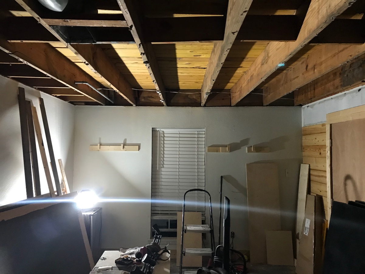 So I went into this phase with just the goal to open up my ceiling for the additional height/industrial feel it will give my music / gaming space - as well as build out my front wall, wire up some ceiling lights and additional outlets/switches, (there are no lights in this room!! It been dark and depressing..) and I am also going to put a ceiling fan in, or at least the wiring and receptical for one. I want to run some conduit behind my build to feed cables to my monitor and other gear, and in general cable manage my room to perfection. I also plan convert my existing 4ft x 4ft owens 703 panels (6 of them) into new panels and a cloud that are more fitting to the design I want to end up.