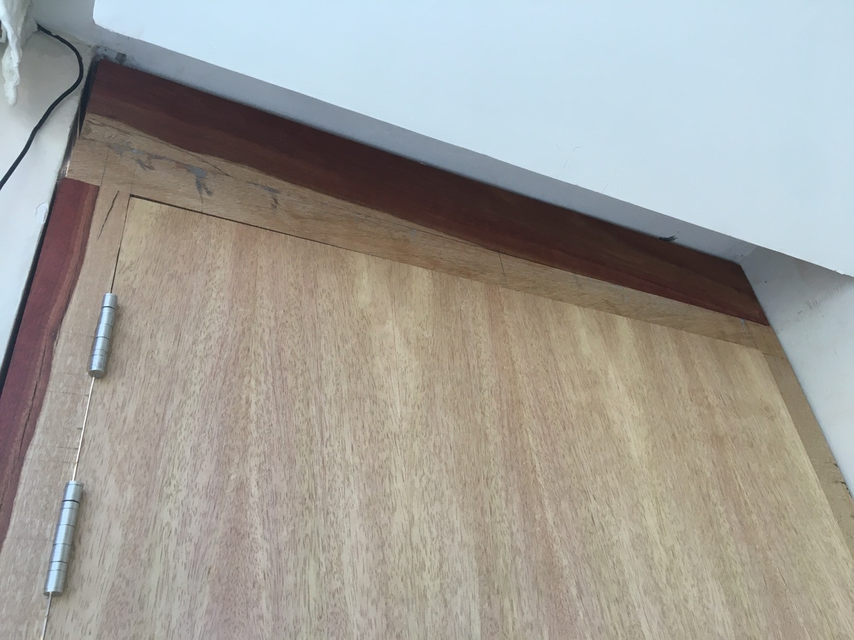 That 910 mm is pretty wide, for a studio door. That's great, actually, as it means you'll have plenty of clearance to get gear and instruments in and out of the room, but on the other hand, it means you will need extra hinges, and they will need to be extra-heavy duty. Think of it this way: when it is open, the door is always trying to fall off the frame. If it could fall off, the fulcrum for that motion would be the lowest hinge (the one closest to the floor). The entire door is trying to rotate around that hinge, and if all of the other hinges failed, that is what it would do. So the entire weight of the door is hanging out there, trying to tear out the TOP hinge, with all its might, by rotating around the BOTTOM hinge. So there's one hell of a lot of stress on those screws at the top, trying to pull them straight OUT of the wood! The weight of the door itself is all in the direction of "down", trying to sheer off the heads of the screws in the BOTTOM hinge, but the stress up high is in the direction of "out", trying to tear out the screws in the TOP hinge along their axis. The wider the door is, the more stress there is on those top screws.This means that, given the width of the door is also set in stone by the supplier to a maximum of 910mm, I am unsure of how to fill in the gaps either side, and above, the door.