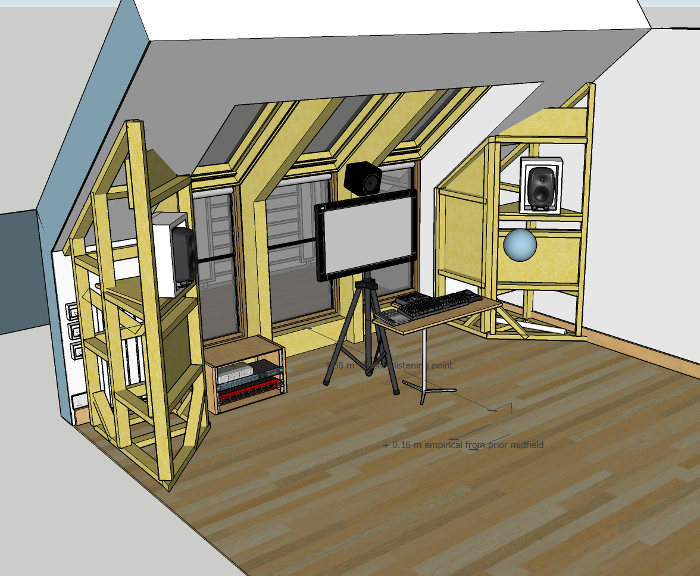 I haven't checked that in your SketchUp model, but Ill try to find time to do that.It seems logical that the monitors should be the same distance from the front of the room, so the distance from acoustic axis to baffle edge closest to centre of the room is kept constant. The most optimum I could come up with was the following;