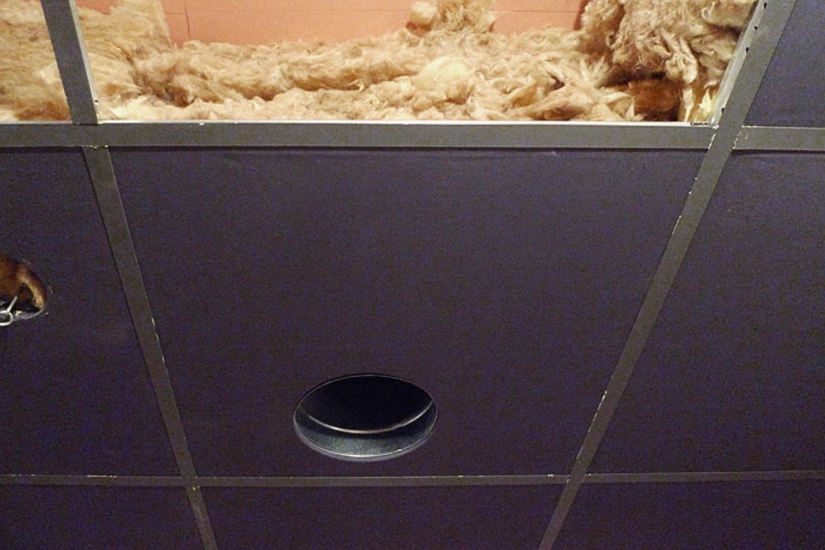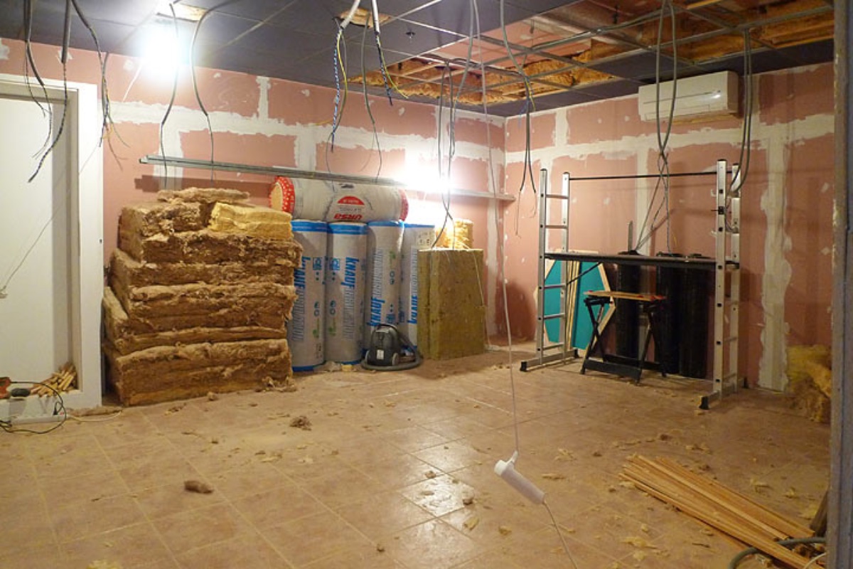 And here you can see 6 large square holes for where lights will go, plus the insulation above the tiles, which, incidentally, has changed the sound in the room quite dramatically.