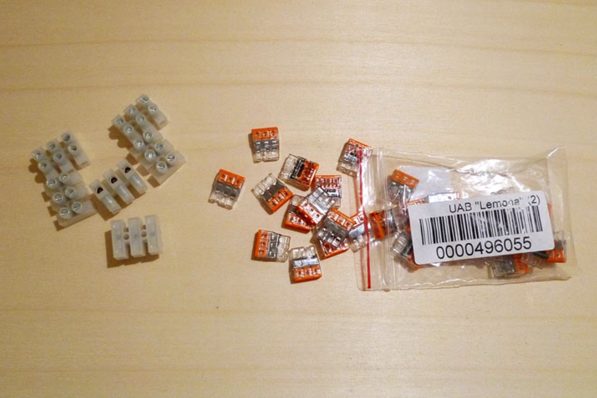 The lamps have small connectors (on the left in the photo below) which are so small I can only insert one cable but I need two (mains in and mains out). Lockdown means I cannot simply pop round to the electrical shop so I ordered the Wago connectors online from Lithuania and waited 10 days for them. It turns out that braided wire, which we are using, is not strong enough to insert into the connectors. I tinned the ends to make the cables stronger but that didn't do the trick. So I have now ordered larger connectors (from the UK) like the ones on the lamps and am now waiting for them to arrive.