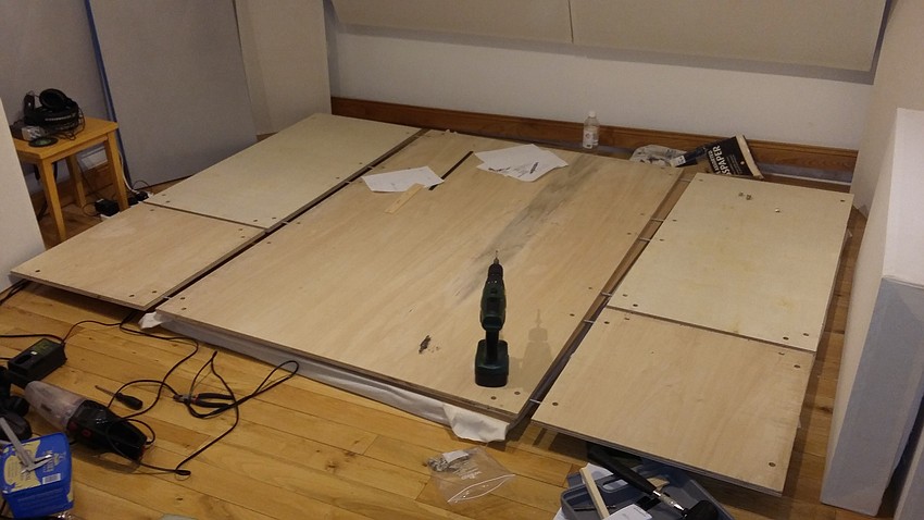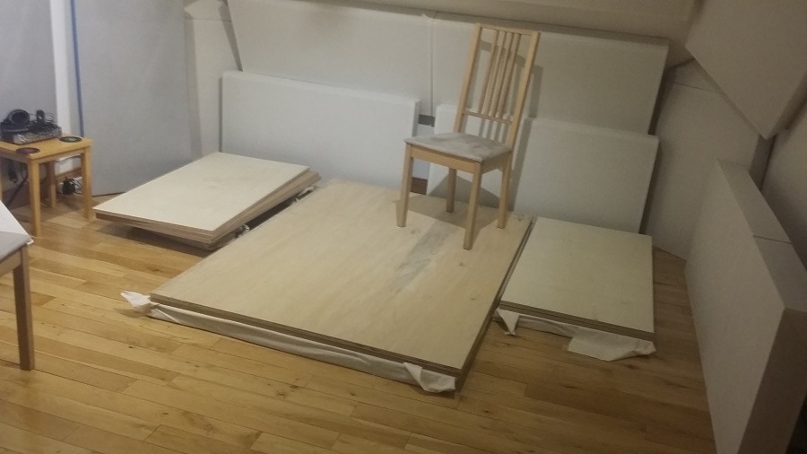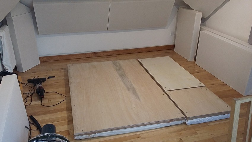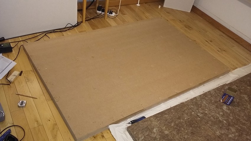 The 18mm plywood and MDF cuts arrived yesterday afternoon, just in time to prepare a quick test for a rehearsal session in the evening. No screwing or green gluing of the board, just the 3 layers lying loosely on top of each other, on top of 50mm thick Knauf Earthwool RS45 insulation slabs. The camera perspective is a bit skewed, the big riser is 1800x1200mm or 6x4 feet;