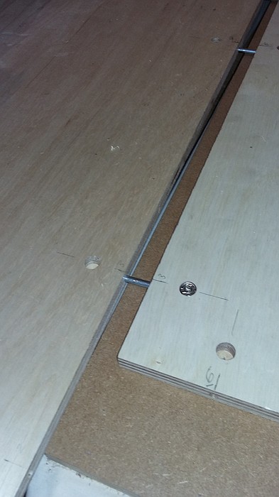 They are joined by the cam lock bolts commonly found on flat pack furniture. I've left a gap for a 9mm edge trim on each riser;
