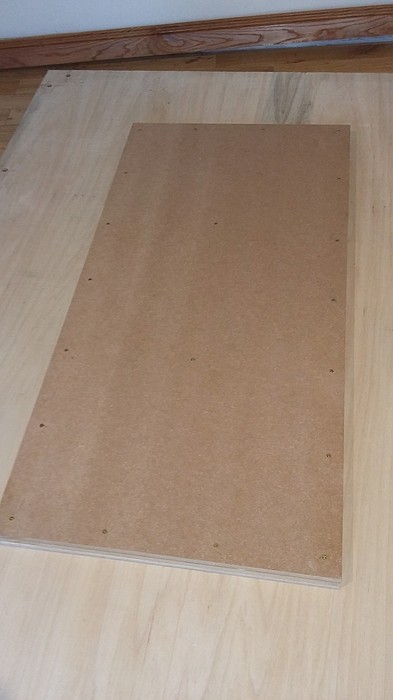 Next was to screw and green glue the layers together. I did the smallest panels first to figure out a good workflow before the larger ones. Screw schedule was 20cm along the edges and ~40cm in the field, as specified by Rod Gervais book p.269. The riser stack was turned upside down, aligned at the edges, and I pre-drilled holes into the two layers of the MDF. Screws were sized 50mm long so they could be screwed into this upside down assembly with sufficient grip on the plywood layer without the tips protruding through it.