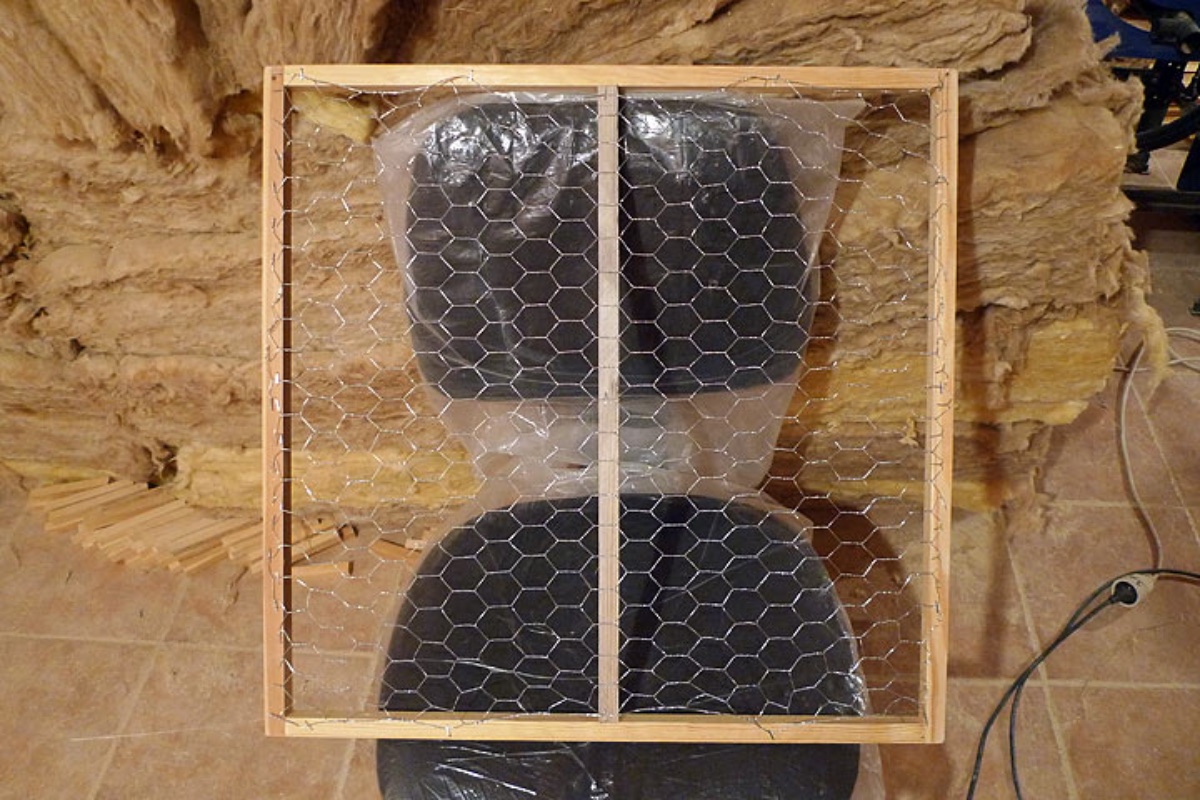 A test shows that the taut chicken wire is strong enough to support the insulation.