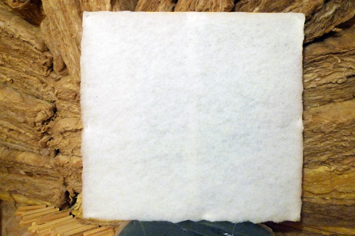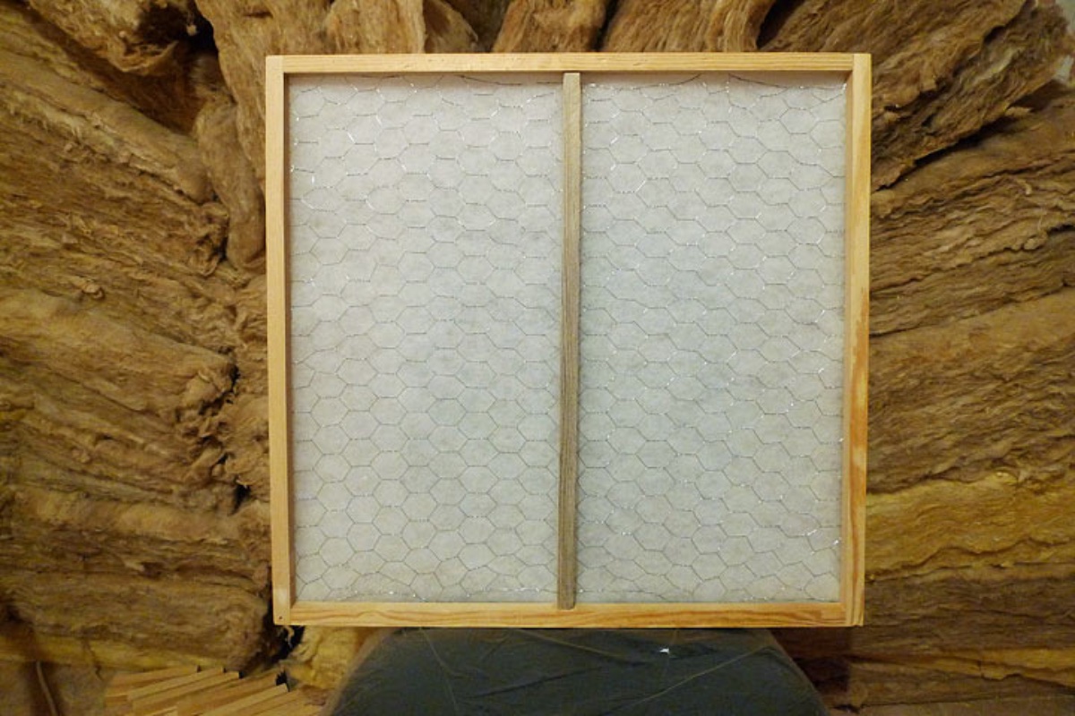 I thought of the three cloud sections as three massive drop ceiling tiles. I worked in a slightly different order: first I stapled the breathable fabric to the underside, then the chicken wire to the upper side (you can see a few ends in the photo below) which means the chicken wire has the thickness of the wood in which it can bow under the weight of the insulation and not been seen as a bulge from below. The polyester batting was laid on top of the chicken wire and then the insulation on top of that. The polyester batting is part of John Brandt's design so I had no choice; it was on the drop ceiling tiles and the cloud and will be on the front edge of the wall traps too.