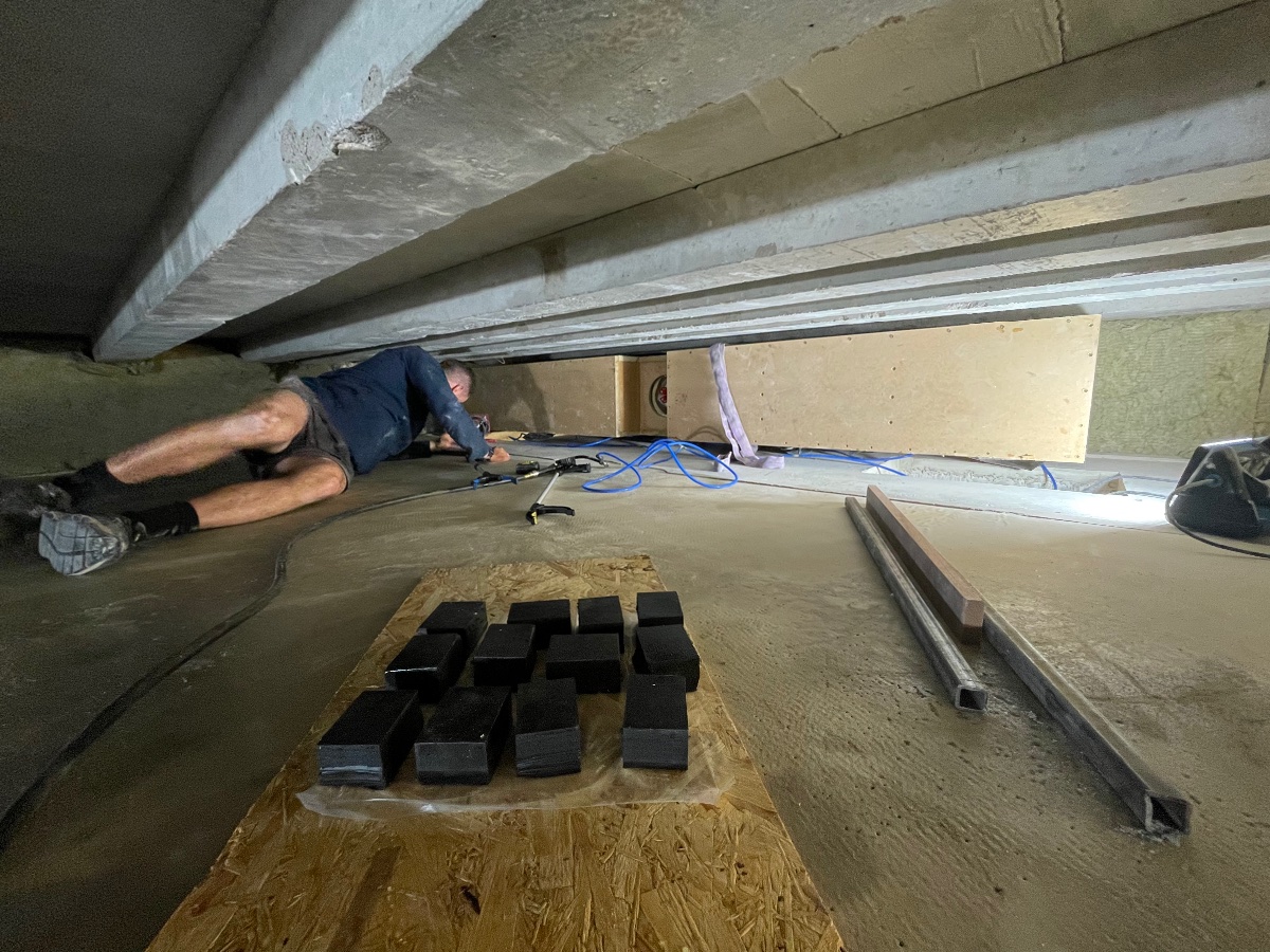 Before insulating we shuttered around the silencer sleeves into the studio and poured concrete vibrating it using an sds drill on hammer… well consolidated concrete!