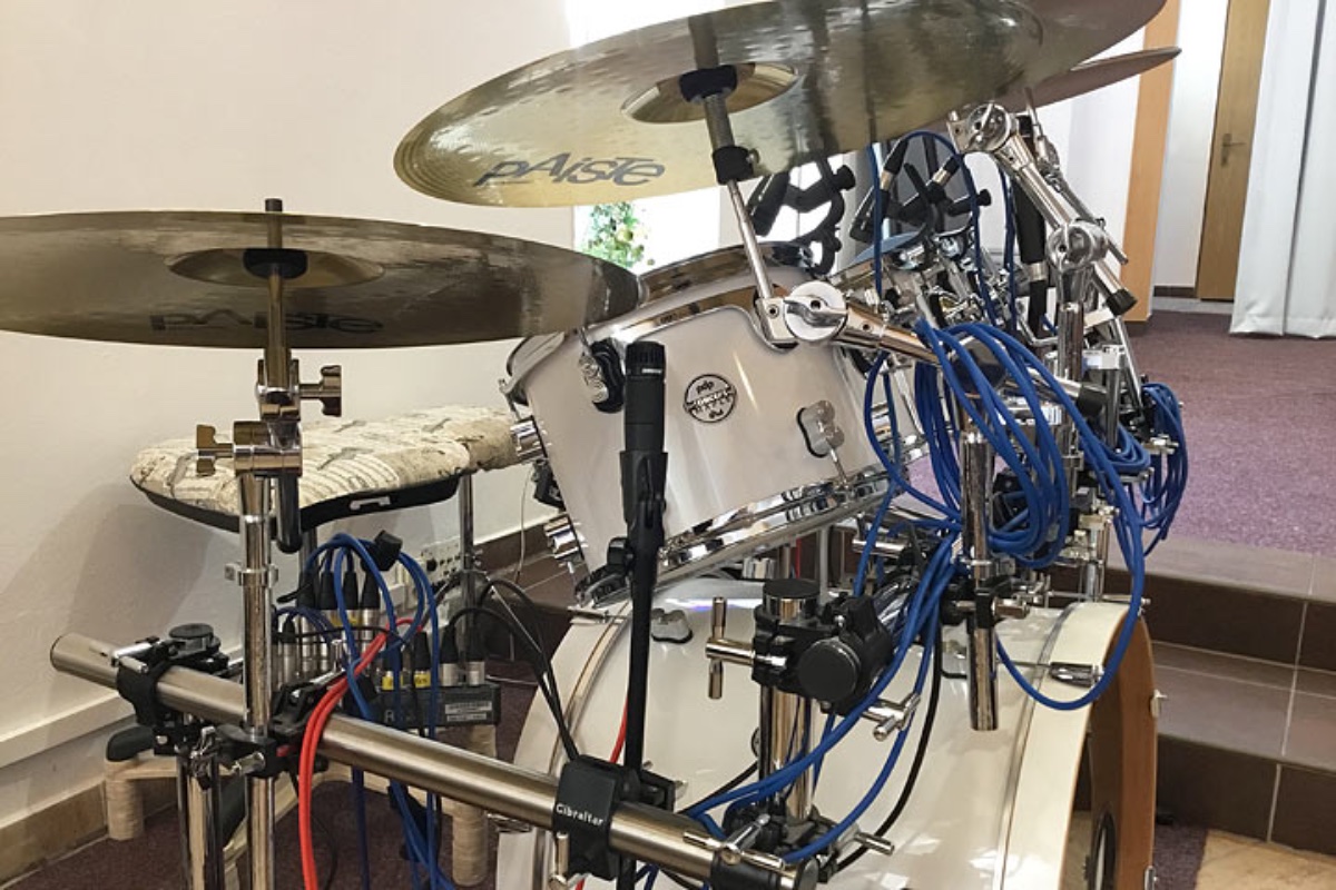 Since the latest lockdown ended in January I have been focussing on the sound of my main kit in a church across town, playing with the sound of the kit in the very reverberant building and figuring out how best to close mike it using 8 mics, aiming to get the best sound (to my ears) with minimum bleed from the rest of the band. Neither studio nor live miking techniques quite work in this situation so it has given me an interesting challenge. Here is a quick glimpse of the setup so far, starting with the overview where the high-hat and snare mics are most clearly visible.