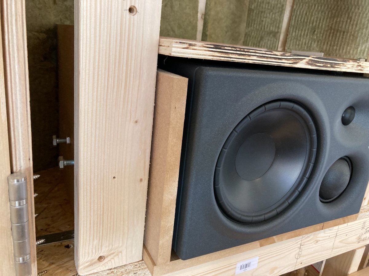 Glenn proposed that my soffit mounting wasn’t working as well as it could. In the first incarnation, despite calculating, measuring and cutting carefully it seemed my boxes were compressing the sorbothane hemispheres more than they should, so the speaker vibrations were travelling into the box and therefore into the structure.