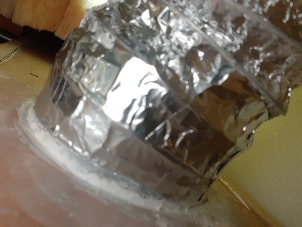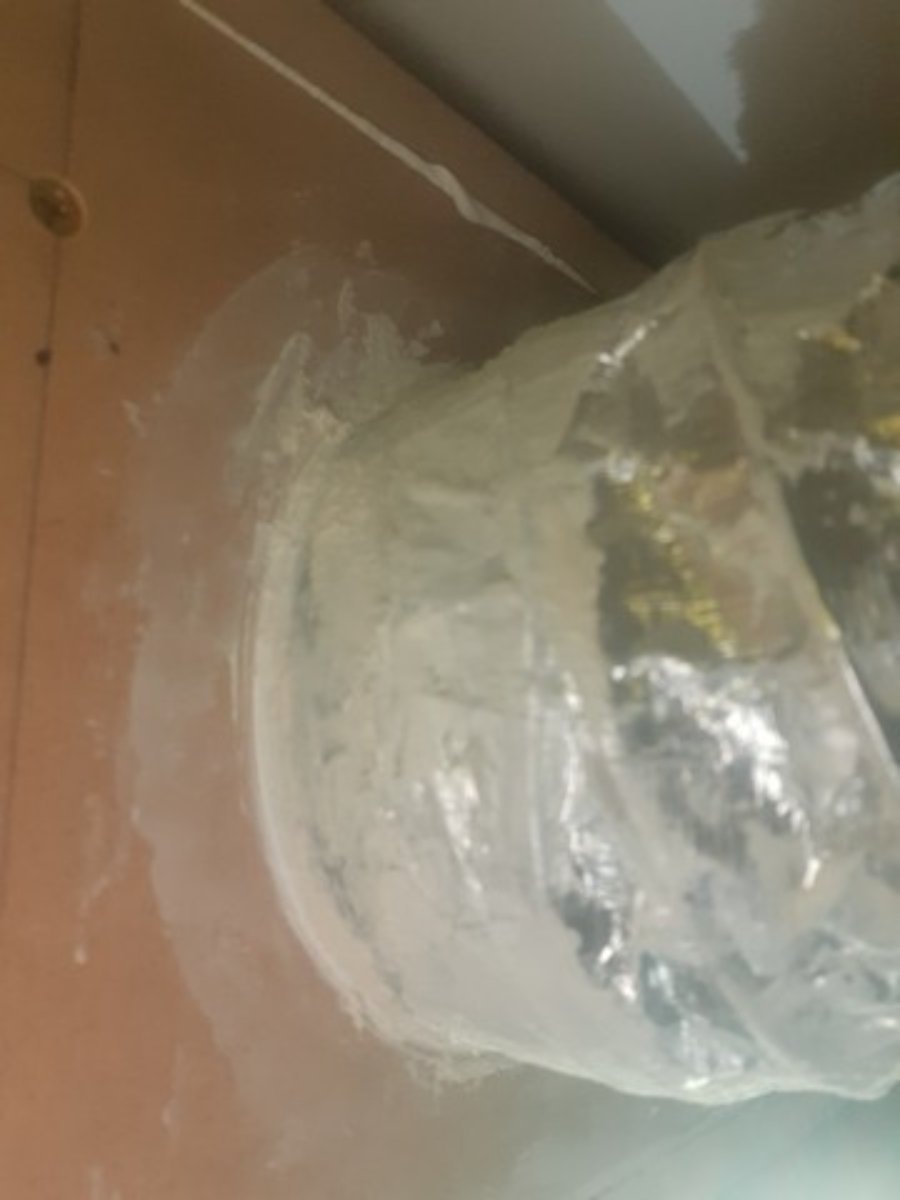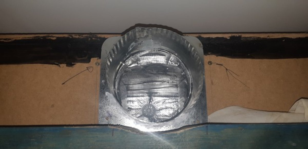 The harder one was the supply end due to the space and that I was working with limited view. I had one crack at getting it on and ended up with mastic everywhere but couldn’t get the flex-duct over the whole of the collar. I cleaned off as much mastic as I could from the collar, let it cure for a few days, cut off the end of the flex-duct that was covered in mastic and tried again a few days later. This time I put aluminium tape around the last 2 inches of the flex-duct to hold the flex part out straight. Success! Give it a few days to cure then tape and attach a couple of o-rings.