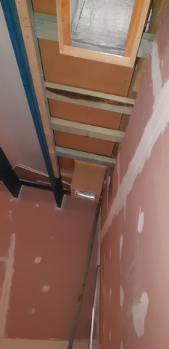The first one I installed in situ - dropping the Fyrchek sheets in from above and doing the backer rod/sealant from above. No option to do the “push up” method as the joists are not parallel in this spot as it’s where the flat ceiling changes to the rake so you can’t “push up”. I’m glad I only have to do one more of those.