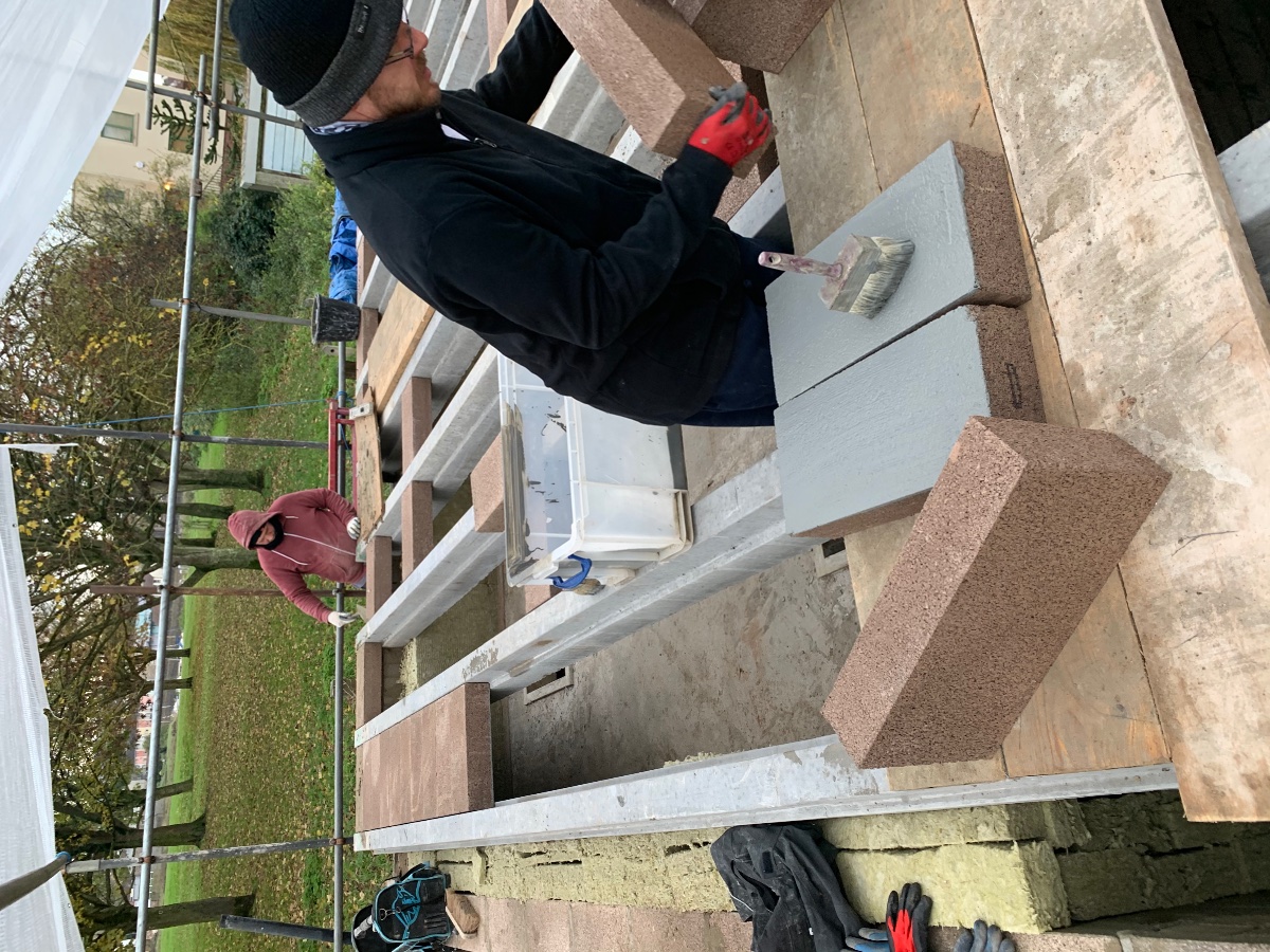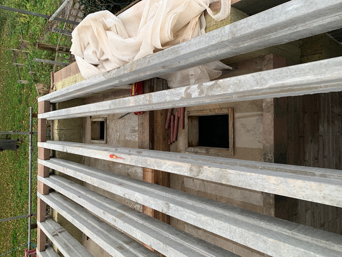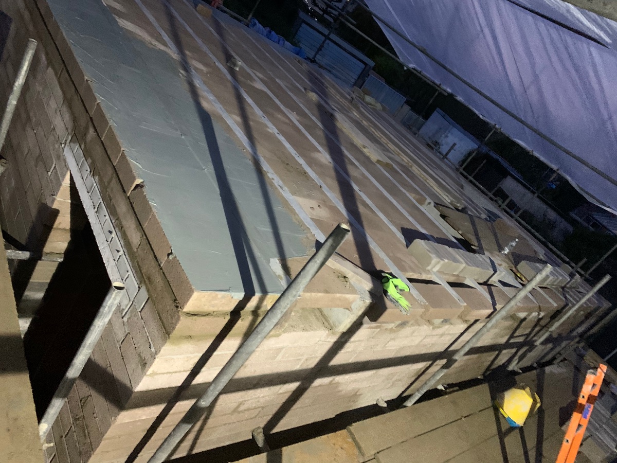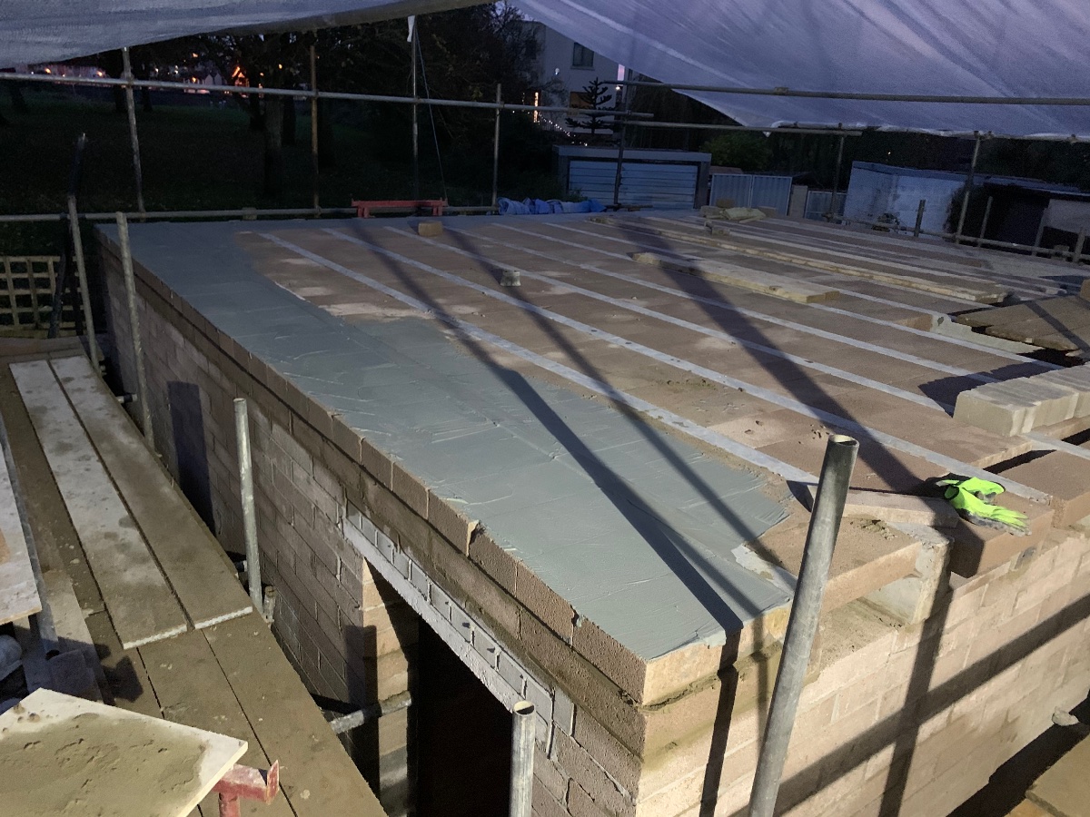 I was hoping to move the concrete contractor a few days ahead so we can make sure the conduit is exactly where we need it but they would reschedule 2 weeks or more away which would leave us with not a lot to do so we’ve been scrambling to finish the roof blocks, slurry the block and beam, build a single course of bricks to retain the thickness of the outer leaf, then get the Damp membrane, insultion and vapour membranes onto the roof, inner room and corridor!