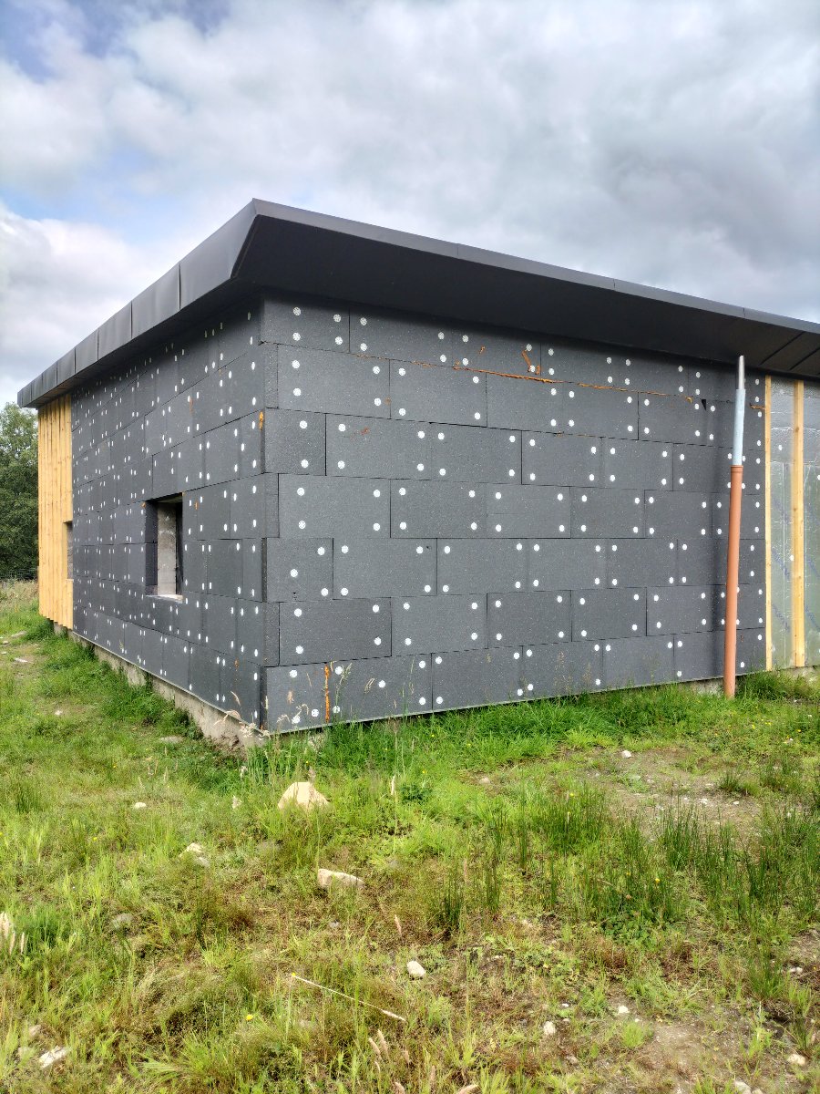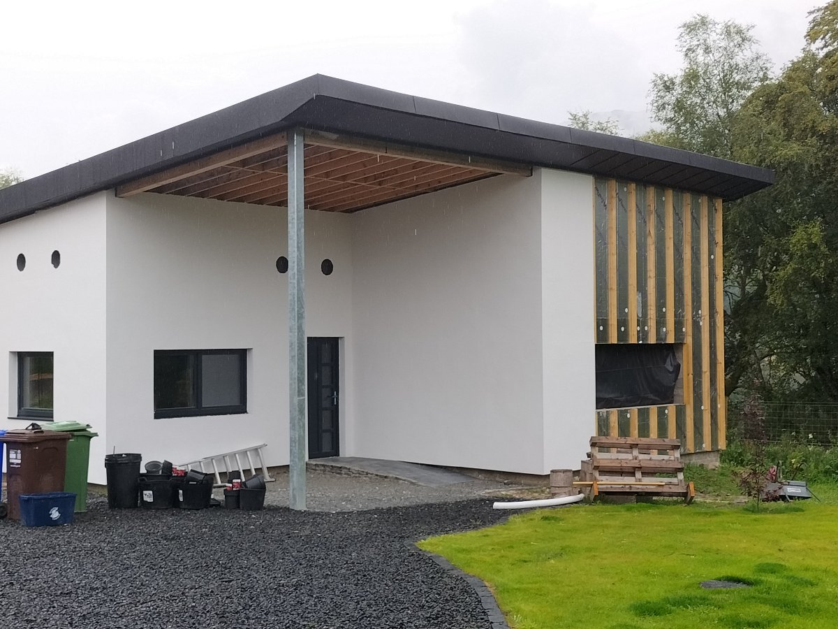 I have managed to put on all the external insulation and battens for the timber cladding sections too. The larch cladding has been on site for a couple of weeks acclimatising while the render was done. I should get started the cladding next week. Hopefully it won’t take me too long as I have been “practicing” on the main house fixing the shit show that my cowboy joiners from hell left me with. Now that is finished I feel confident to get the building finished and move inside.