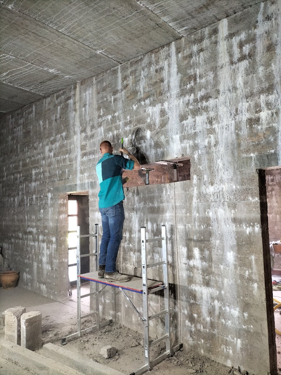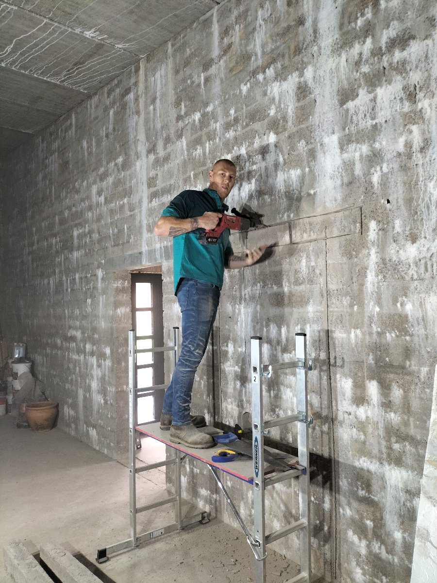 We had two options. Either leave it where it was and treat the hell out of the door itself OR brick up the old door opening and cut a new one. I decided to get someone to cut a door sized opening in the correct place and drill four 300mm holes through the concrete for the air intake and exhaust ducts. My son and I inserted two concrete lintels and I carefully removed all the bricks to reuse as many as possible bricking up the old door. I haven’t gotten round to bricking up the old door yet as the weather has been too good but it is high on the priority list for the coming weeks.
