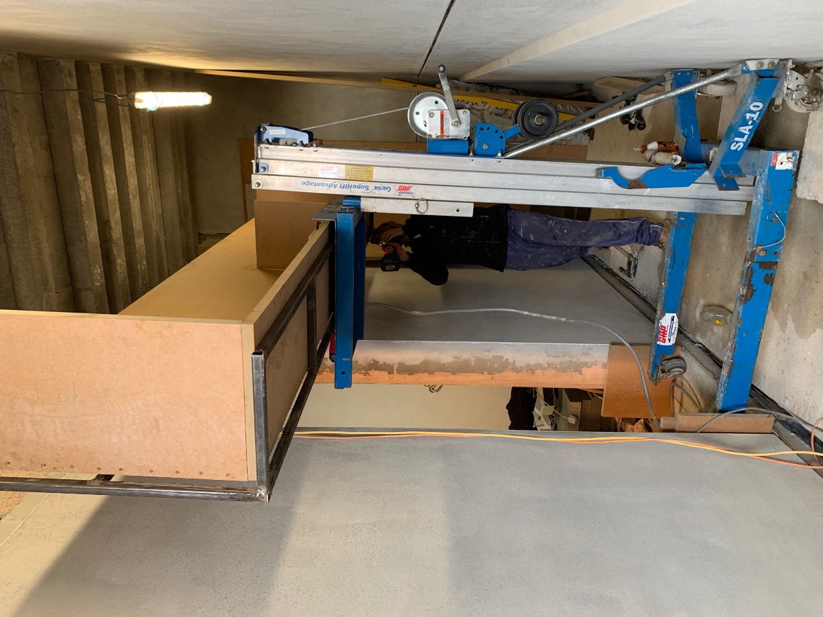 We quickly realised that the metal frame had better be the other way around to aid tipping and pulling it between the ceilings.