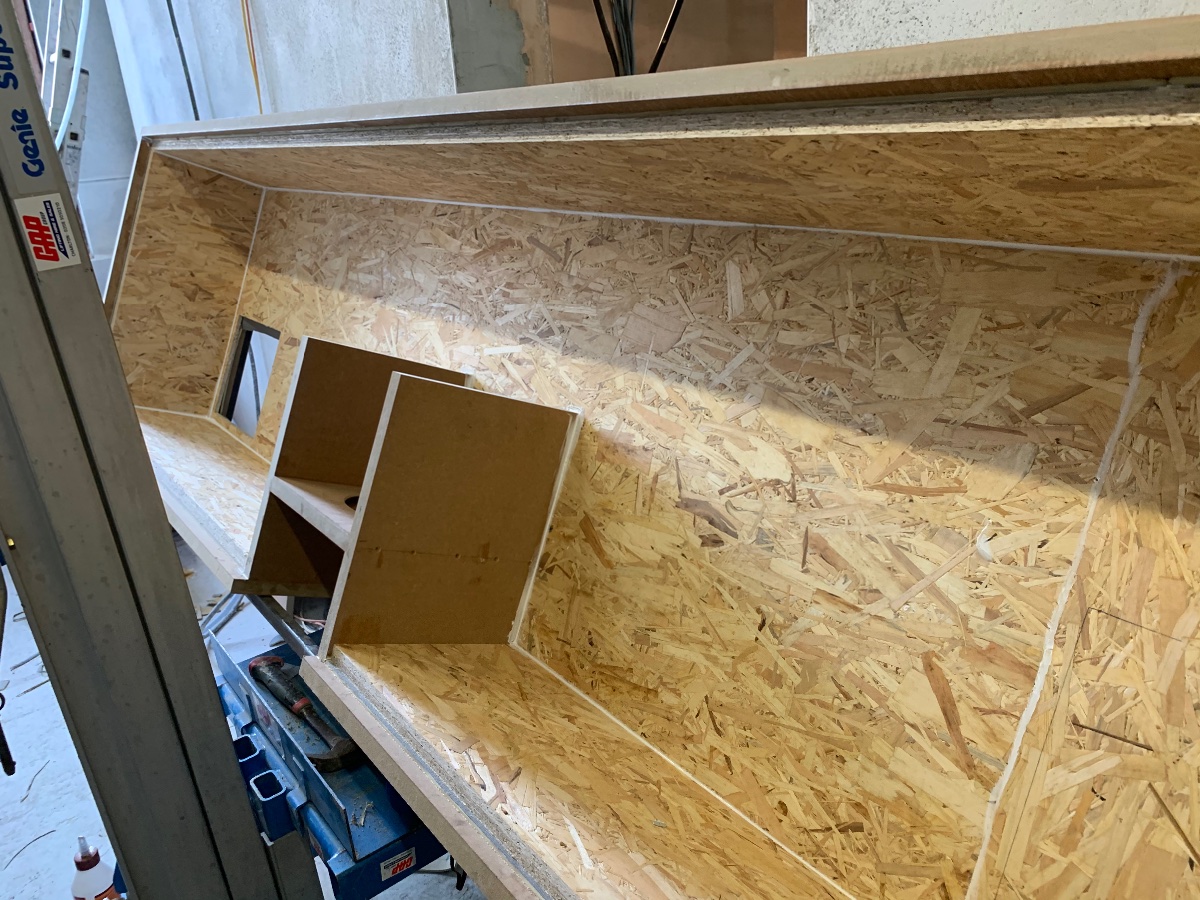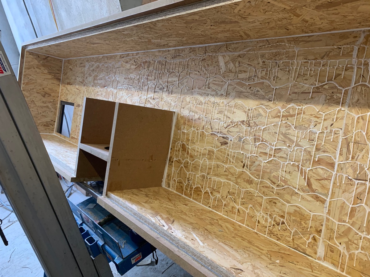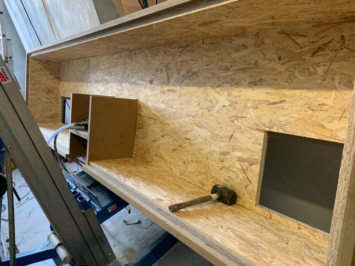 Next was the OSB. As the silencer is longer than the OSB is available, we have two sheets of 11mm so we can stagger the long joints. These were easier to measure and cut accurately. All glued, pinned then screwed but not copiously as Stuart mentioned the function of the MLV will work best if it is not held rigidly.