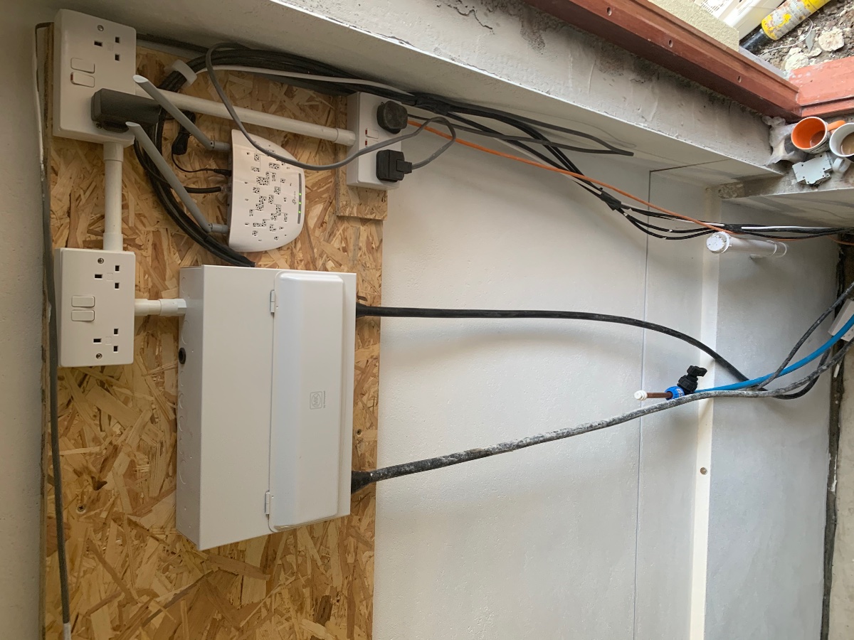 We did pain some of the corridor, the main room walls have had a mist coat and a full coat and sorted out the services coming in and out! We now have 4 x cat6 cables to a switch in the house so we have a wifi access point...no more leaving the phones at the door! I made the power connection and terminated at the building consumer unit, fitting a few sockets for our build use on the service board. I also wired up the cable to the studio consumer unit and wired a couple of sockets and put up a couple of very bright led batten lights which will end up in the corridor!