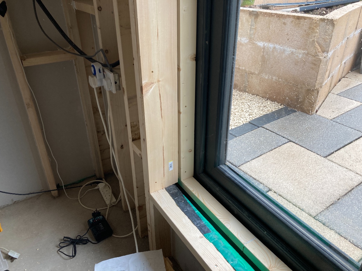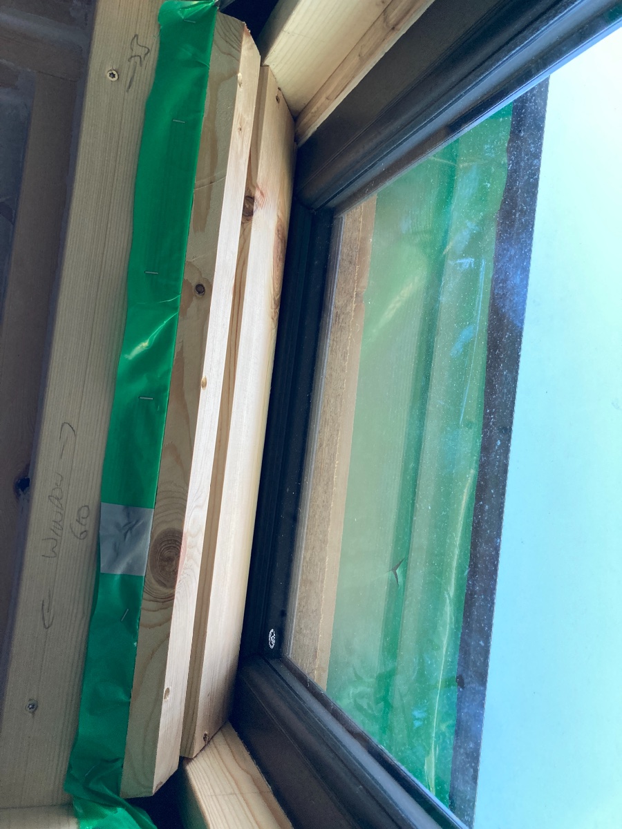 I then added some of the stained trim to go in the window cavity and was pleased that the stain id used matches the UPVC frame pretty well. Up close the finish is not great because I’d obviously put too much on in places. I don’t think I’ve got the energy to sand it back though!