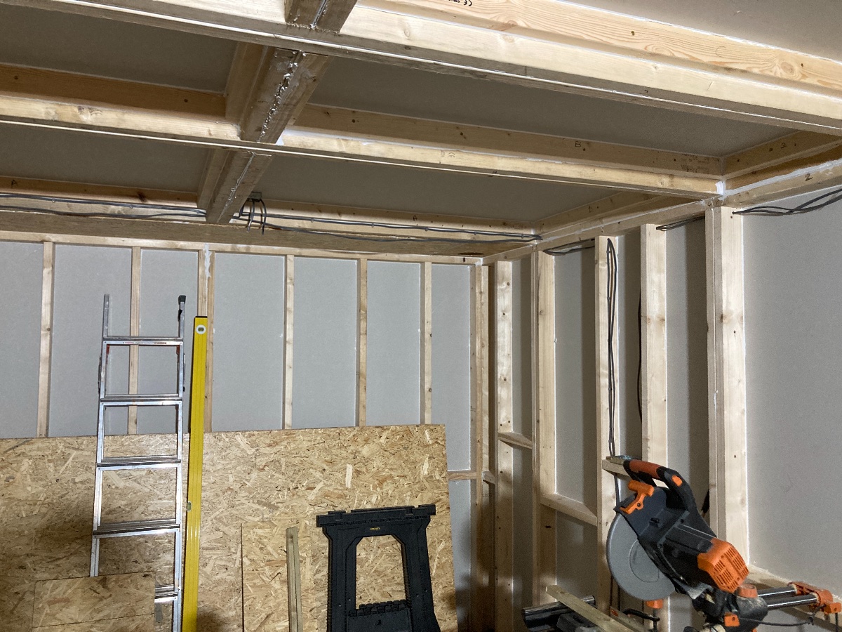This afternoon’s work on the soffit framing made it feel like a studio for the first time, which was good. With any luck tomorrow I’ll get the framing and osb in place plus make the speaker boxes. Then I’ll be ready to take a baseline REW reading once the window and door glass arrive and are fitted.