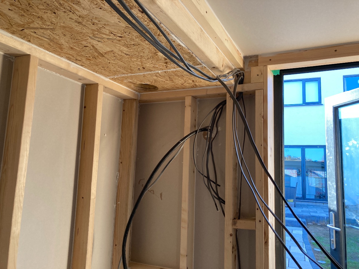 Since my last post I’ve been progressing the cable clipping and wiring of sockets etc. Like with so many things about this build, it amazes me how long it takes to do certain jobs. Cable clipping the mains power and lighting cables around the top of the frame and down the studs to the sockets has taken longer than expected. I can’t finish the job as I am waiting for some washers to arrive that will enable me to bolt the ceiling joists together and I have a bunch of cables running around one particular bit of ceiling to get back to the consumer unit. These will all be hidden.