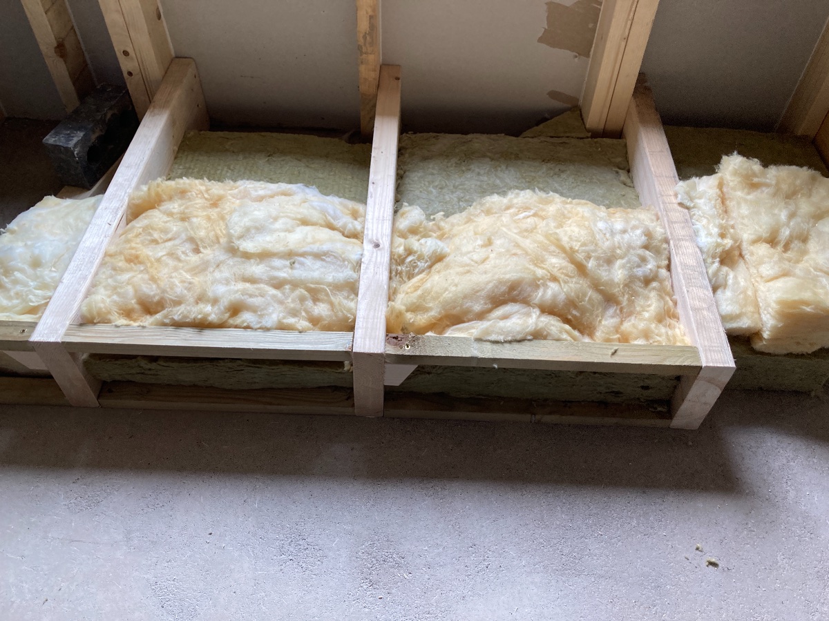 Finally, I made a good start on the steps down into the studio. Because these will have an air cavity it decided to fill the cavity with rockwool and leave it open to the front. My thinking is that this may help absorb some sound and if not I can always cover the front up with wood. Because of this decision, this meant I had to faff around adding extra wood Barton’s between the joists and stapling fabric to them. The pictures make this clearer.