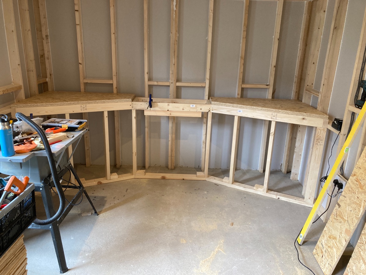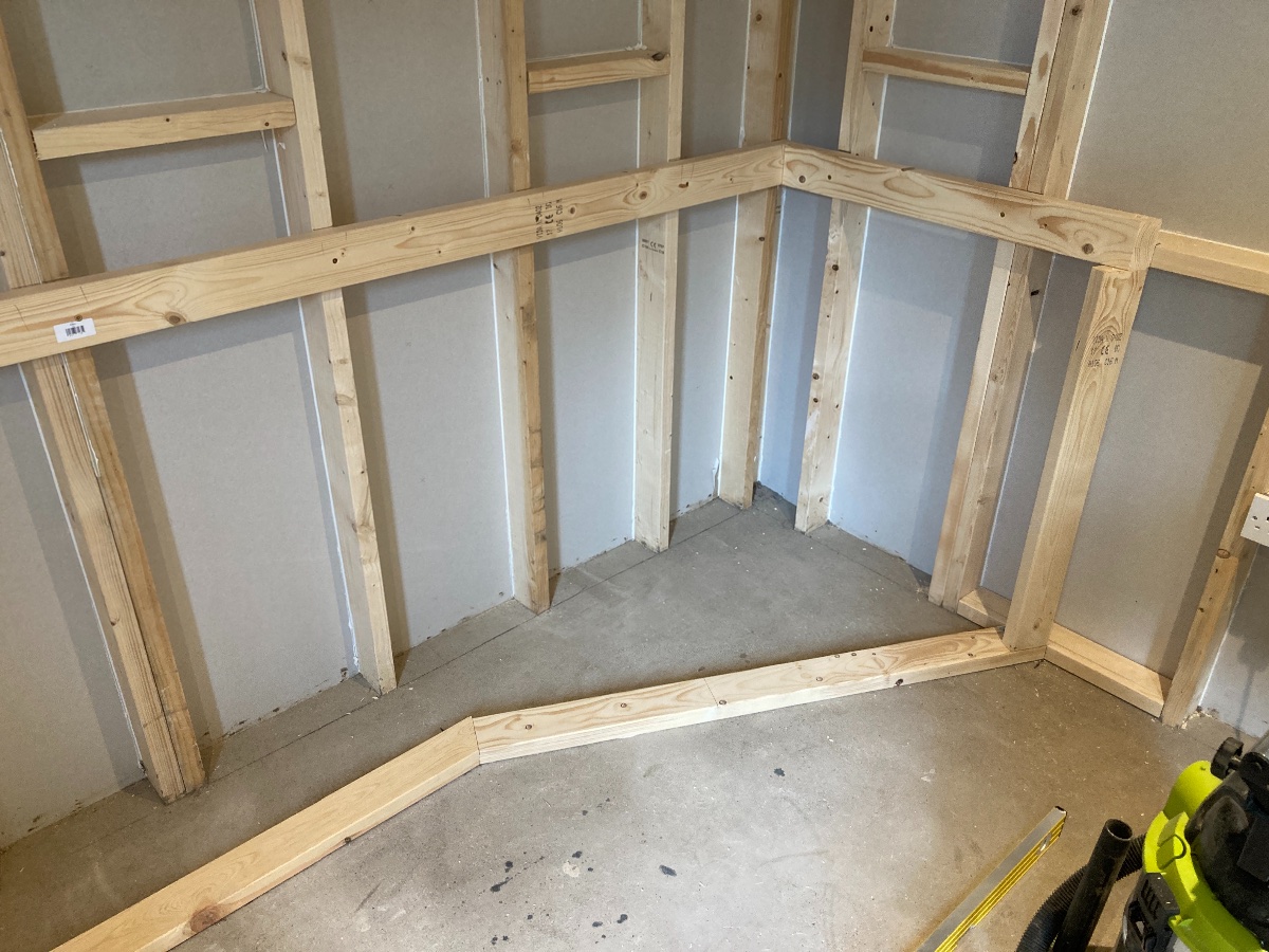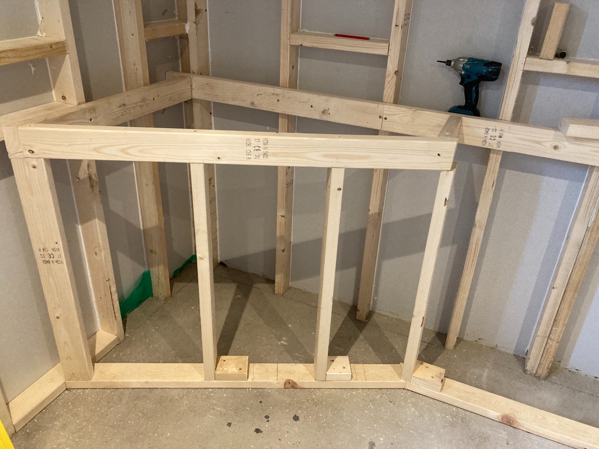 I finished off the framing of the soffit wall shelf, and cut two layers of OSB into triangles for the tops. I put the one cut for the right side on the left and discovered that despite using a spirit level and measuring etc something was wrong because it wasn’t the same shape. I decided it was right to get the symmetry correct at this stage so did some bodging to the frame.